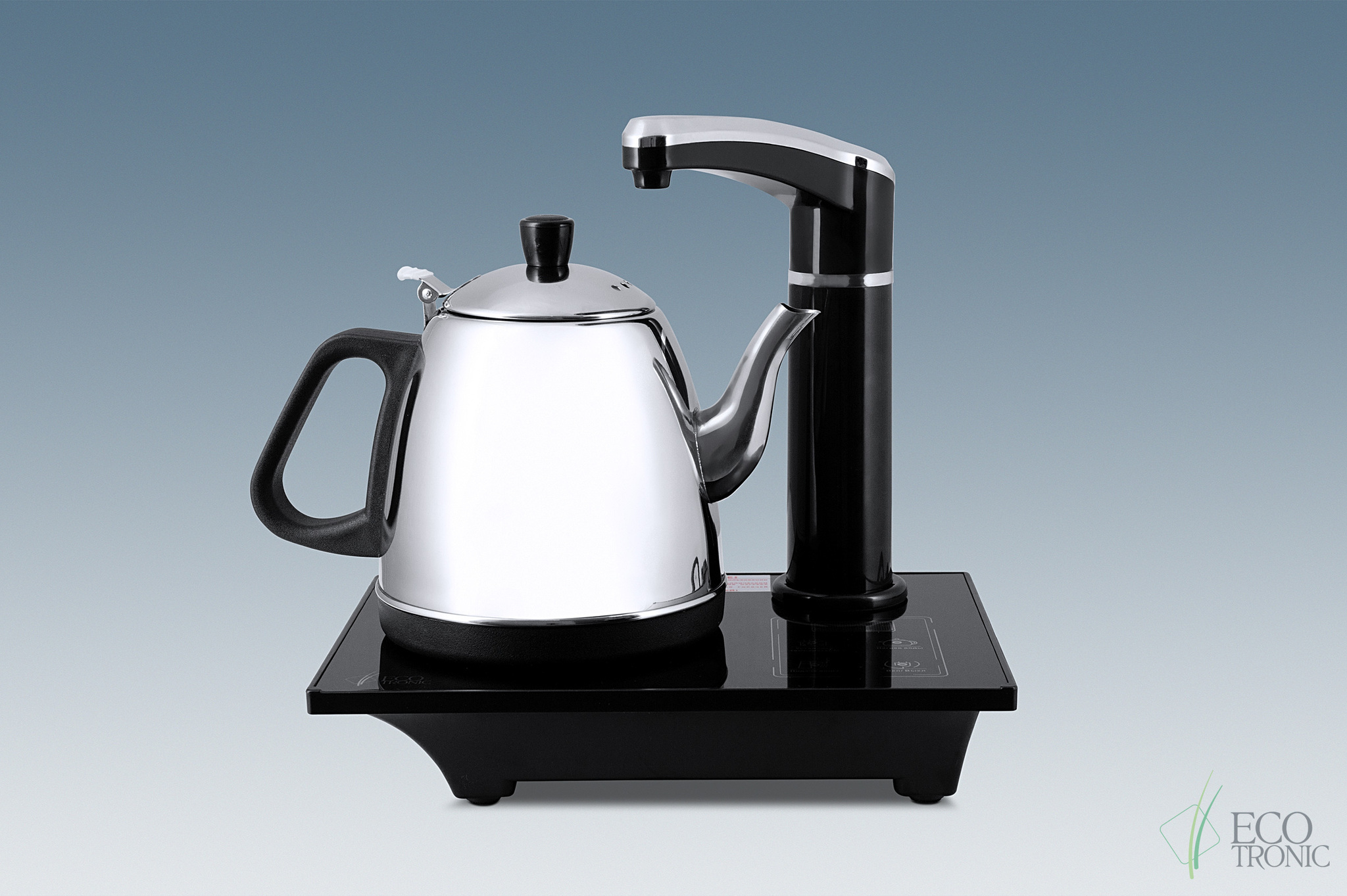 Чайный столик-помпа Ecotronic TBP-1 – это компактный прибор с электрическим чайником, краником и встроенной помпой подачи воды. Столик устанавливается на подходящую ровную поверхность, а гибкая трубка забора воды выводится в удаленно установленную бутыль с питьевой водой. Управление осуществляется с помощью удобной сенсорной панели с информационным дисплеем и индикаторами нагрева и подачи воды. На дисплее отображается текущая температура воды. Вода комнатной температуры подается из крана, горячая – из чайника после кипячения. Можно задать диапазон нагрева воды от 40 до 100°С. Двойная защита чайника от перегрева. Функция трехкратного кипячения*. Изготовлен из безопасных материалов: пластик, пищевой силикон, нержавеющая сталь, стекло. Столик черного цвета, с металлическим чайником. Объем чайника 1 л. В комплекте: столик, кран, чайник, силиконовая трубка 1,4-1,5 м, инструкция. Размеры в собранном виде (ДхШхВ): 26x19x26 см. * – функция трехкратного кипячения поддерживает наличие горячей воды в чайнике долгое время. Если чайником после первого кипячения не воспользовались, то при падении температуры воды до 90°С чайный столик произведет повторное кипячение. И так до 3х раз, после чего автоматически отключится полностью. В коробке 12 шт.