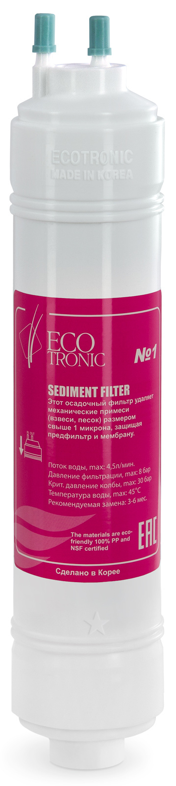 Фильтр #1 Ecotronic Sediment 12”. U-type. Седиментный (осадочный) фильтр. Пр-во Юж. Корея. Размер 12дюймов. Ресурс 3000 - 10000 литров в зависимости от качества исходной воды. Рекомендуемая замена: 6 месяцев. Имеет выходы для быстрого соединения типа цанга-цанга. Может использоваться в любых моделях пурифайеров Ecotronic. КОРОБКА 30шт.