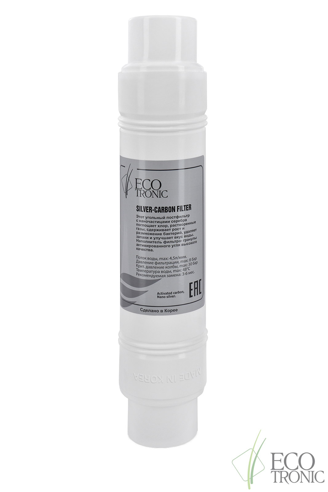 Твердый фильтр с нано частицами серебра. Устанавливается до мембраны UF или RO. Твердотелый фильтр не выделяет угольную пудру, что лучше сказывается на состоянии пор мембраны. Содержание серебра оказывает противомикробный эффект. Как и другие угольные фильтры Ecotronic Silver block carbon поглощает хлор, растворенные газы, сдерживает рост и размножение бактерий, удаляет запахи и улучшает вкус воды. Размер 12" I-тип. Фитинги для подсоединения фильтра приобретаются отдельно.