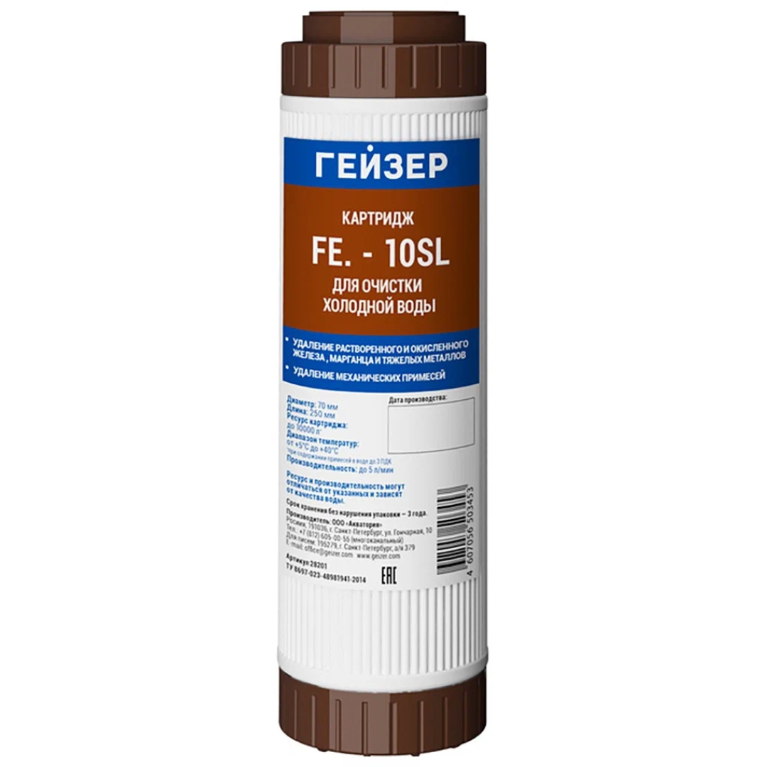 Картридж Fe SL10" используется для удаления растворенного и окисленного железа, марганца, тяжелых металлов.Картридж Fe SL10" выполнен из ионообменного засыпного материала с полипропиленовым постфильтром 5 мкм на выходе. Используется для очистки железистой воды. Рекомендуется при содержании растворенного железа до 2 мг/л.