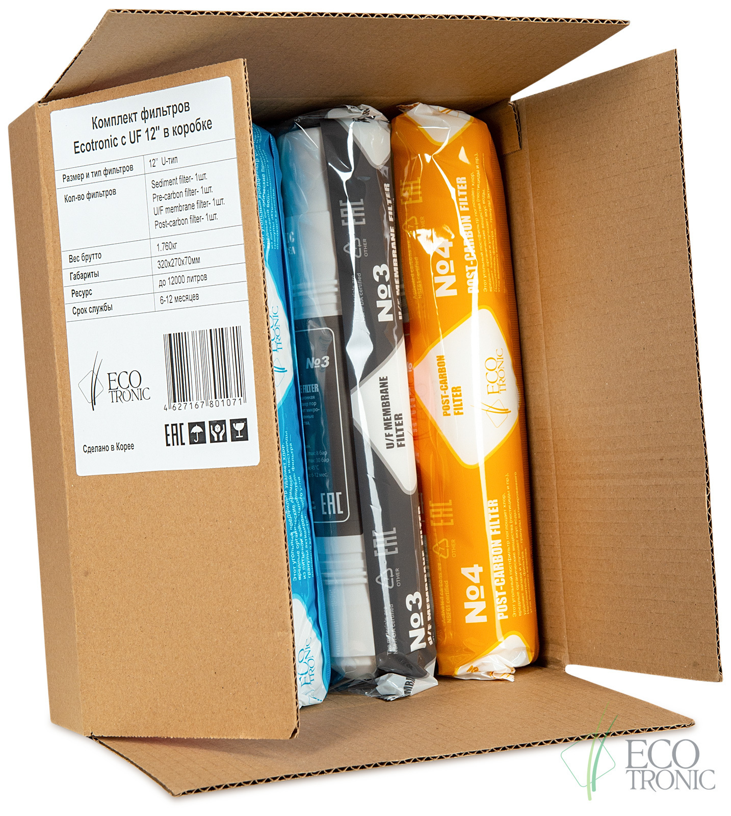 Комплект сменных фильтров (картриджей) в коробке для настольных и напольных пурифайеров с ультра-фильтрационной мембраной (UF). Подобные пурифайеры маркируются после дефиса xx-U4L или xx-U4T, где xx - серия и номер модели, U - ультрафильтрация, 4- ре ступени очистки, L или Т - напольный или настольный. Рекомендуемая замена фильтров: не реже 1 раза в 6 месяцев. Ресурс каждого картриджа до 10 тыс. литров в зависимости от качества водопроводной воды. При большом потреблении (в больших офисах, фитнесах и т.п.) фильтры могут меняться 1 раз в 3 или 2 месяца. Размер: 12 дюймов. Пр-во Юж. Корея.