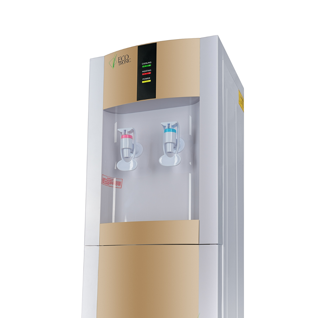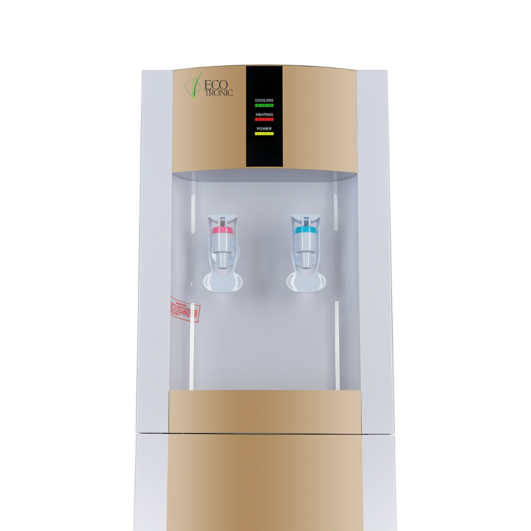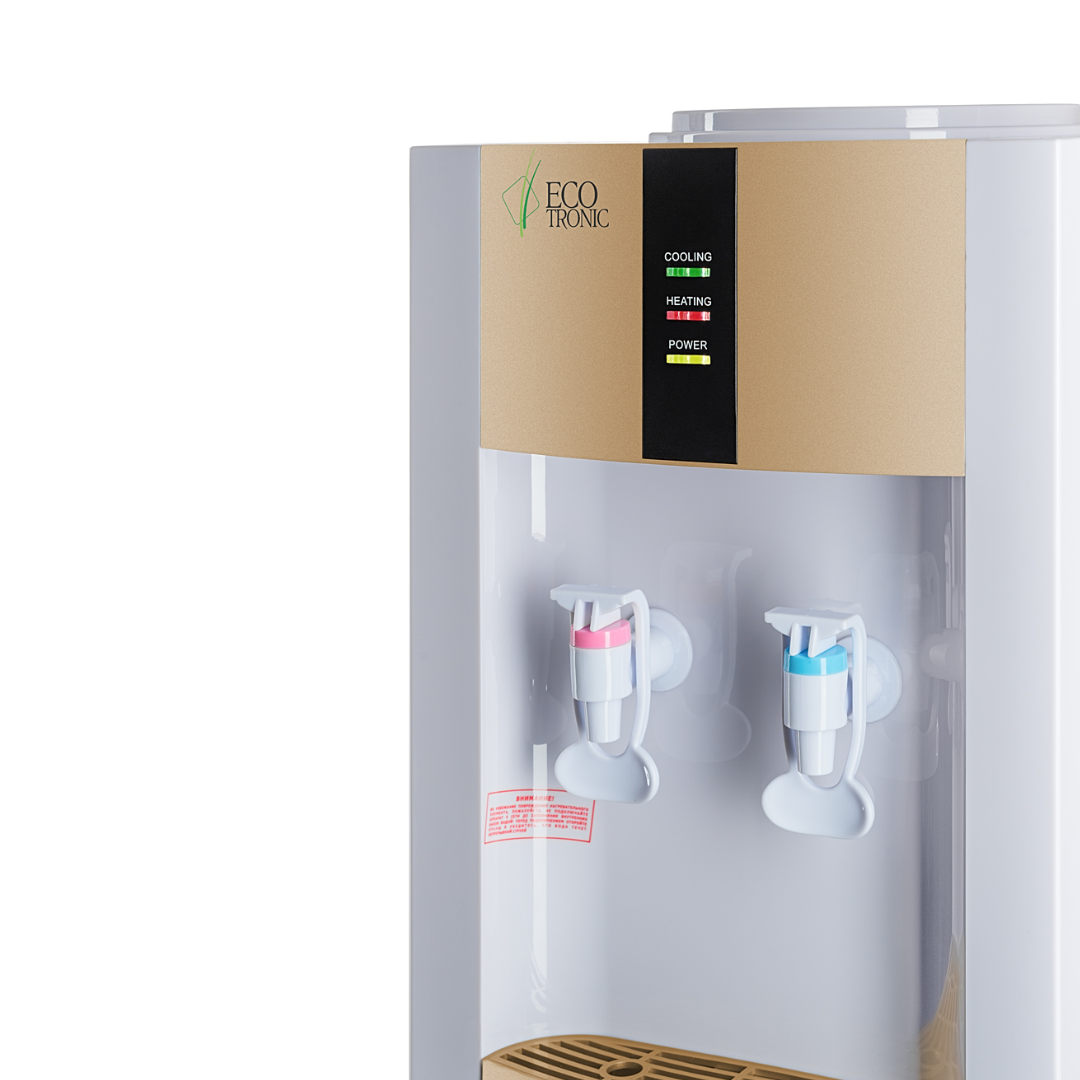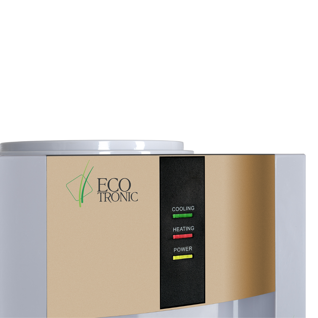 Напольная модель белого цвета с золотистой вставкой. Напольного типа. Cо шкафчиком. Электронное охлаждение. Краны «Нажим кружкой». Отличие от дешевых аналогов - разборный бак горячей воды (не сварной) для простого и не дорогого ремонта в дальнейшем, штуцеры кранов из нержавеющей стали. Наши аппараты дороже - потому что лучше. Выбирайте настоящий Ecotronic, а не дешевые аналоги.