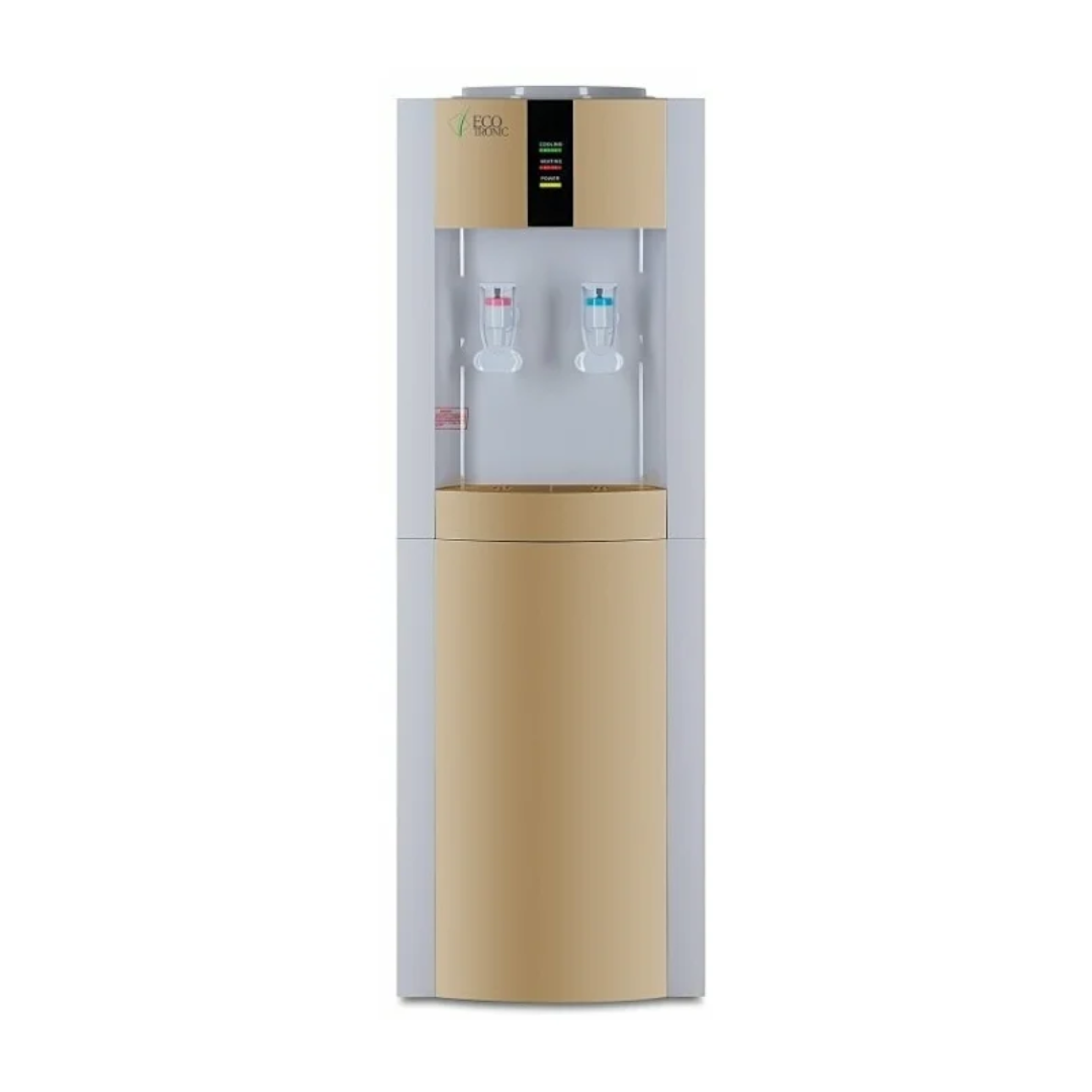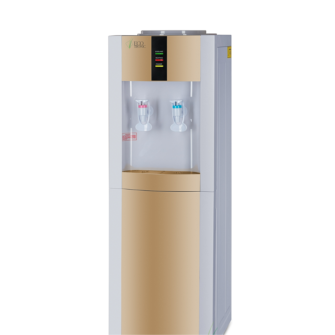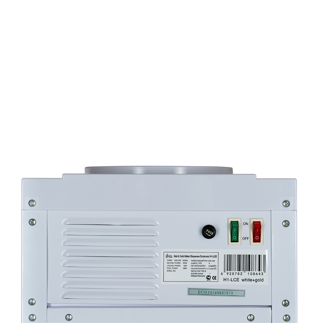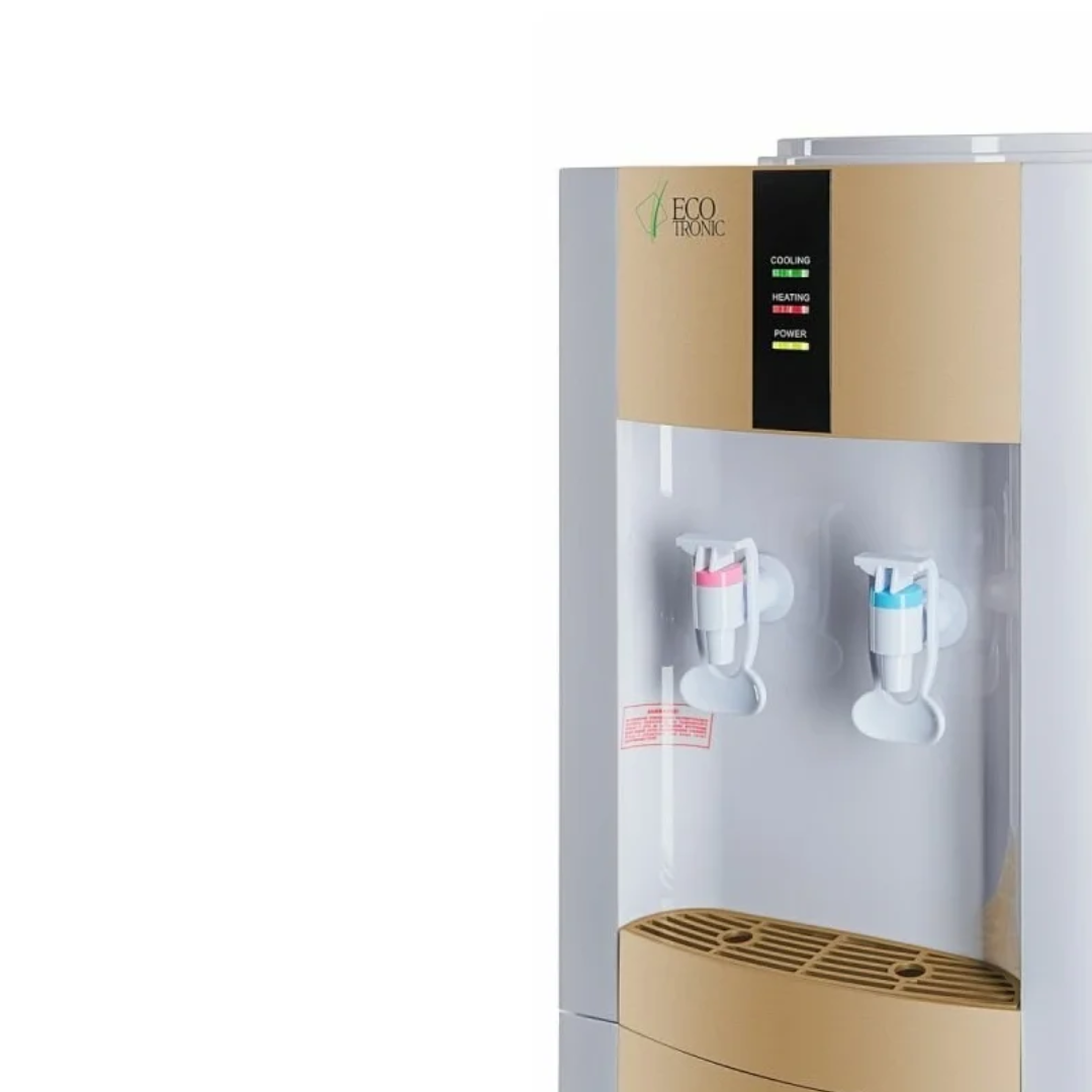 Напольная модель белого цвета с золотистой вставкой. Напольного типа. Cо шкафчиком. Электронное охлаждение. Краны «Нажим кружкой». Отличие от дешевых аналогов - разборный бак горячей воды (не сварной) для простого и не дорогого ремонта в дальнейшем, штуцеры кранов из нержавеющей стали. Наши аппараты дороже - потому что лучше. Выбирайте настоящий Ecotronic, а не дешевые аналоги.