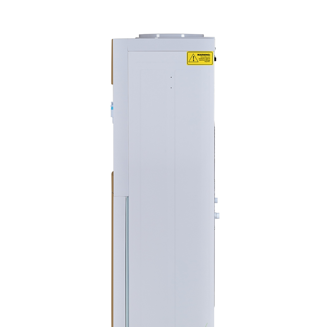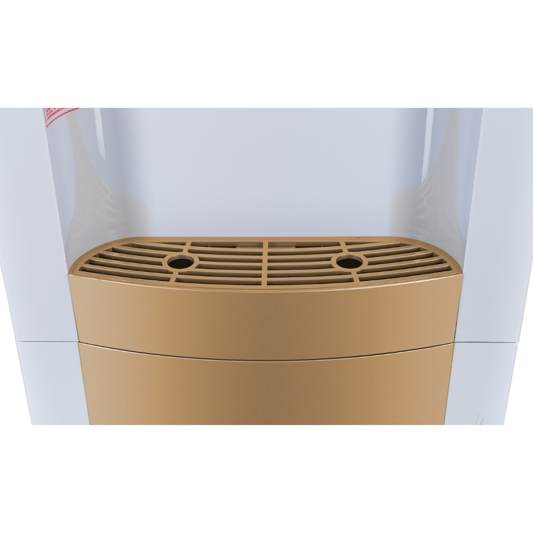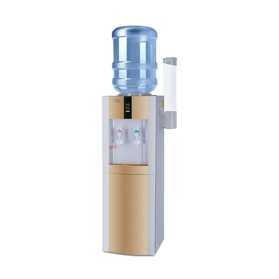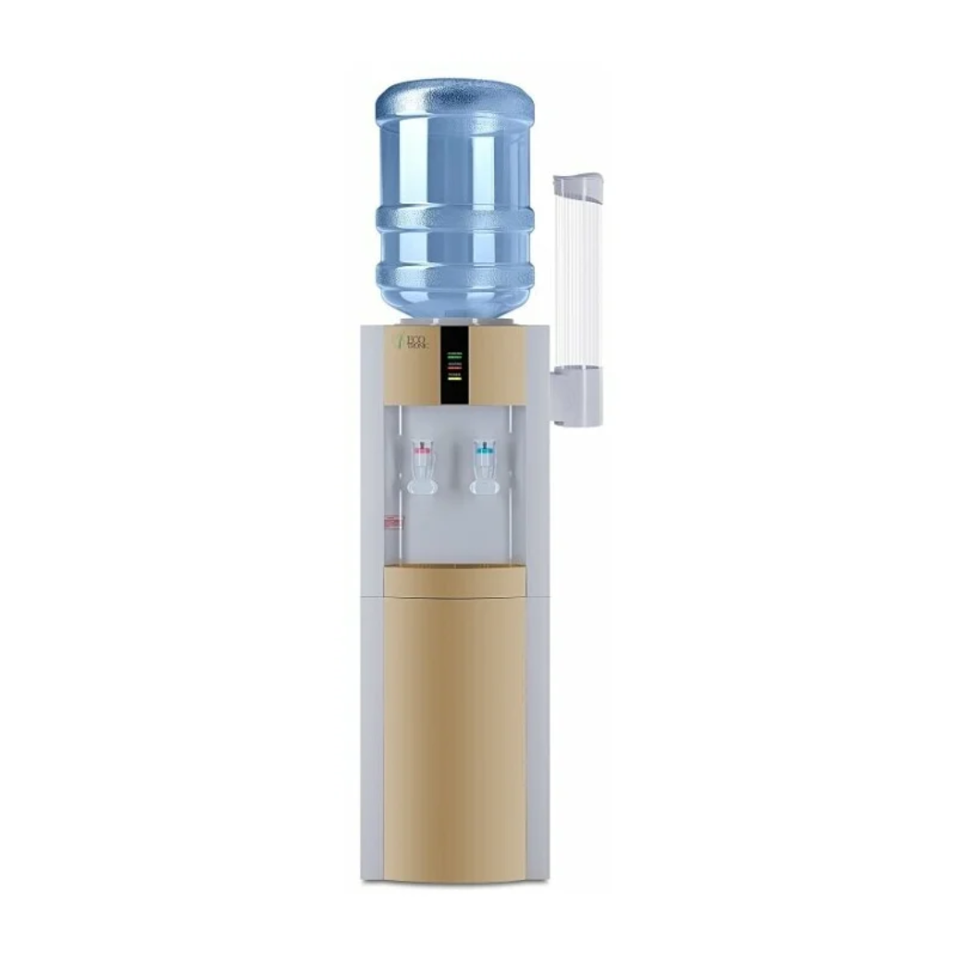 Напольная модель белого цвета с золотистой вставкой. Напольного типа. Cо шкафчиком. Электронное охлаждение. Краны «Нажим кружкой». Отличие от дешевых аналогов - разборный бак горячей воды (не сварной) для простого и не дорогого ремонта в дальнейшем, штуцеры кранов из нержавеющей стали. Наши аппараты дороже - потому что лучше. Выбирайте настоящий Ecotronic, а не дешевые аналоги.