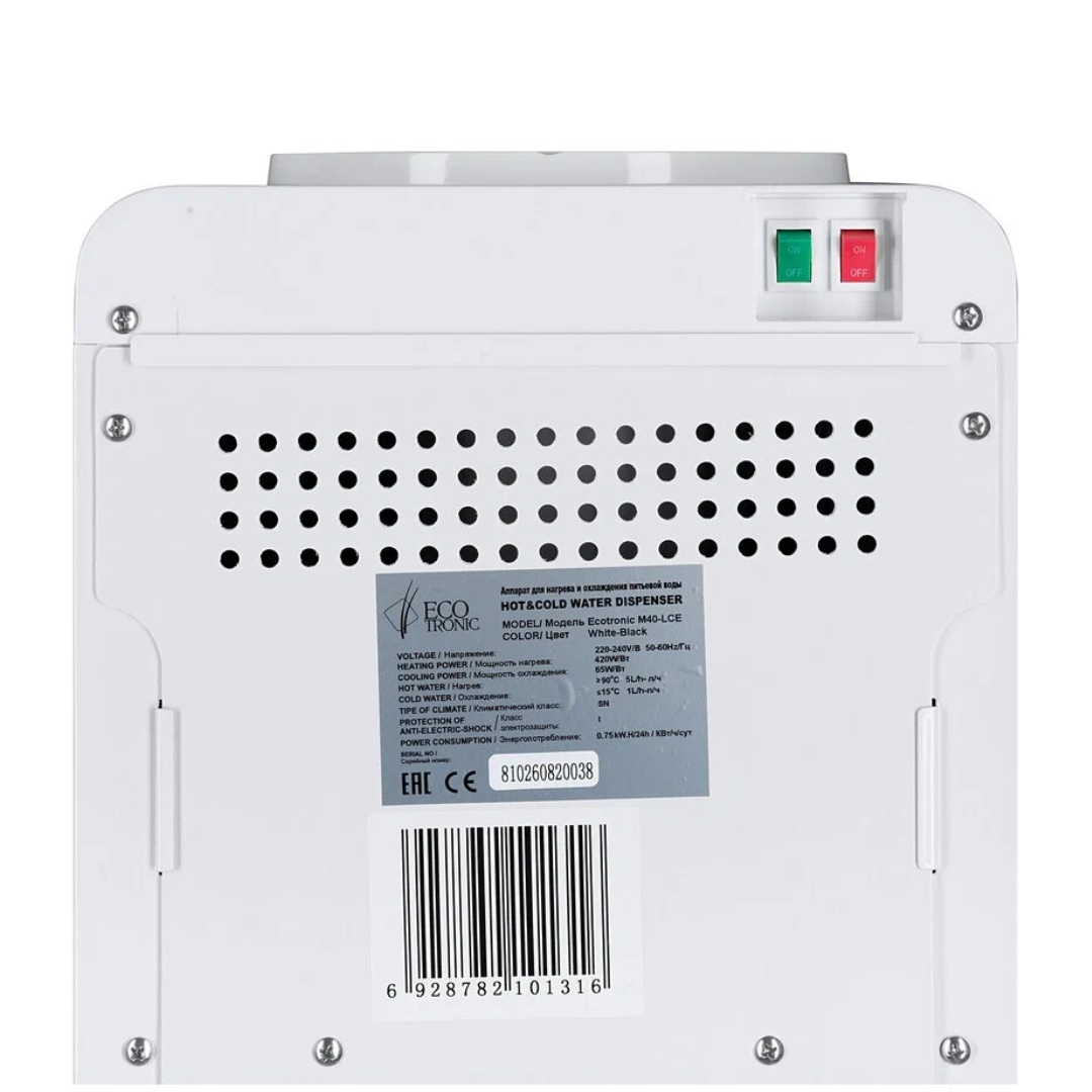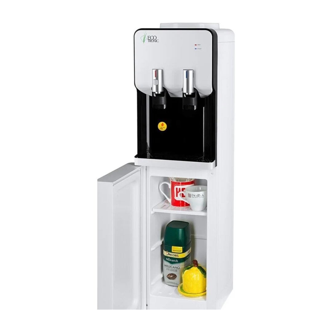 Кулер со шкафчиком для хранения чая, кофе, стаканчиков и т.п. Электронное охлаждение. Высокий удобный аппарат с оригинальным дизайном. Корпус белого цвета, на передней панели элегантная черная вставка. Индикация режимов нагрева, охлаждения и готовности воды. Краны «нажим кружкой», защита от ошпаривания на кране горячей воды. Выключатели нагрева и охлаждения воды расположены на задней панели.