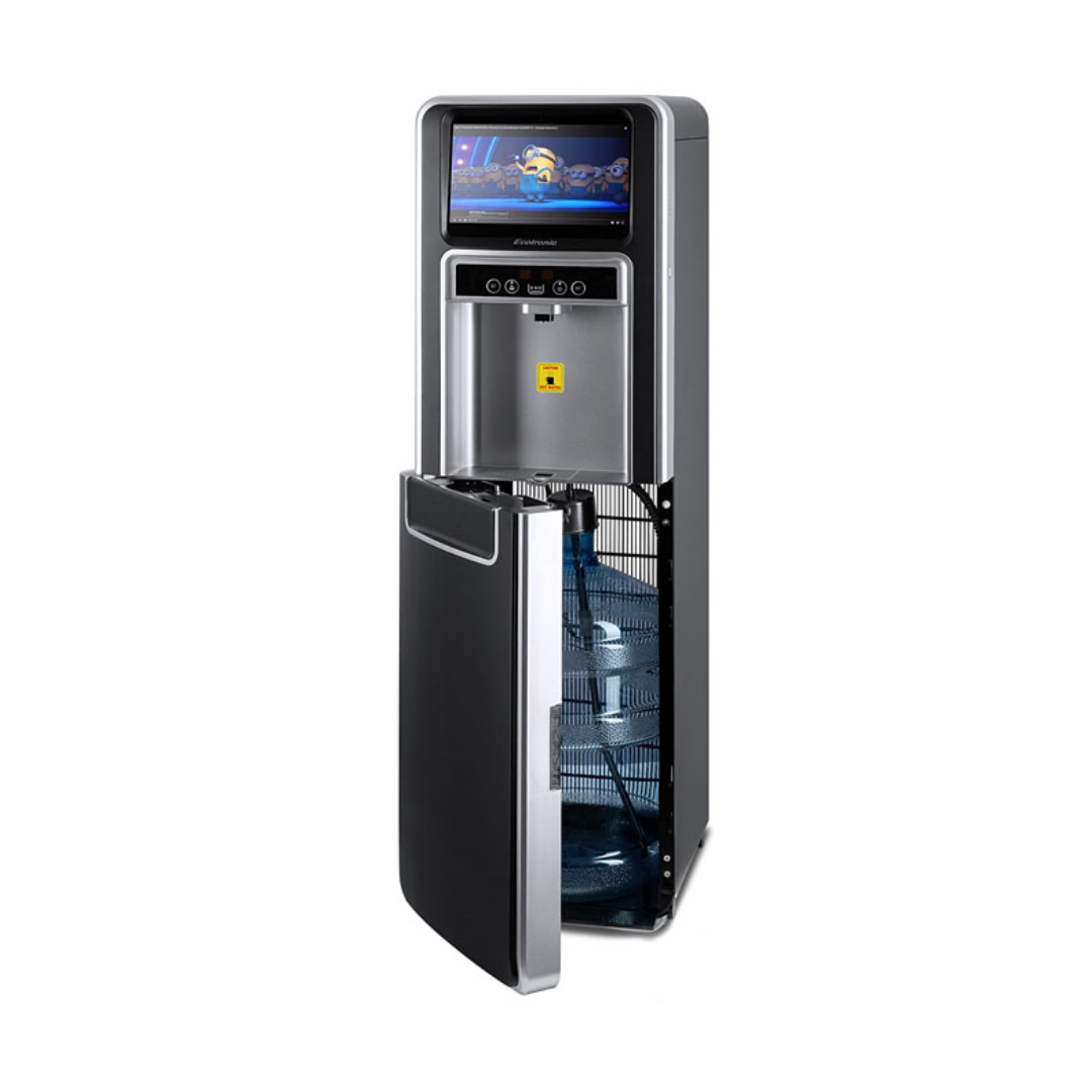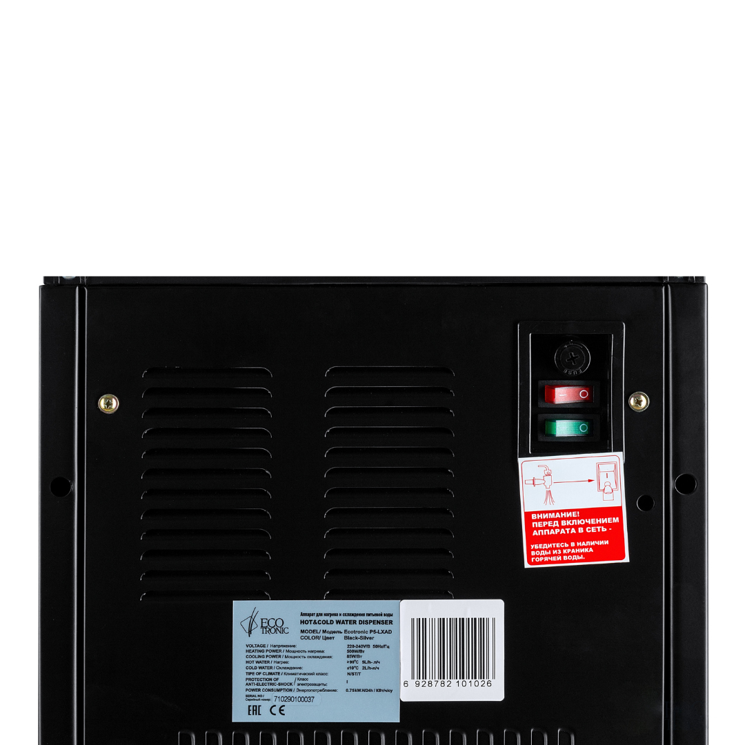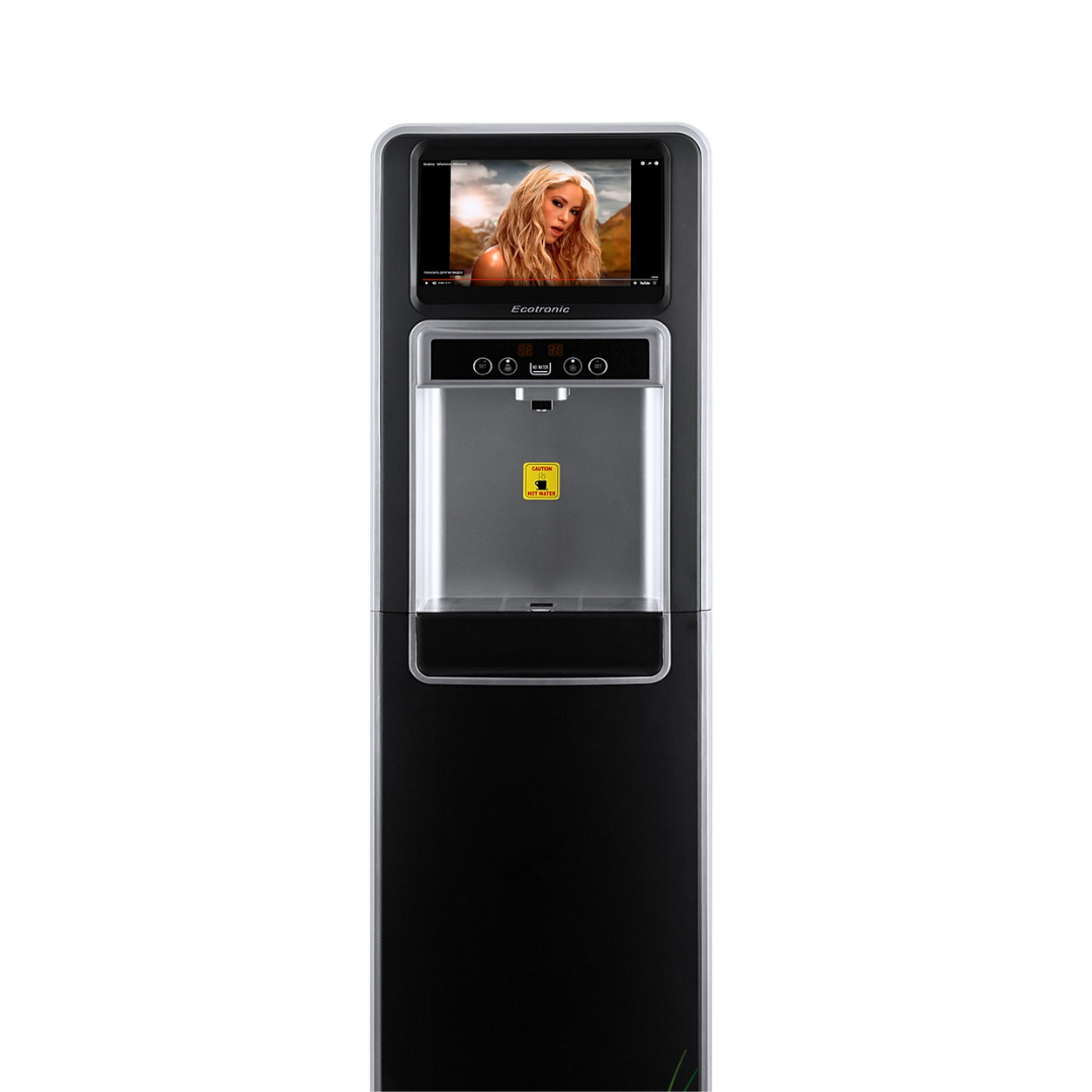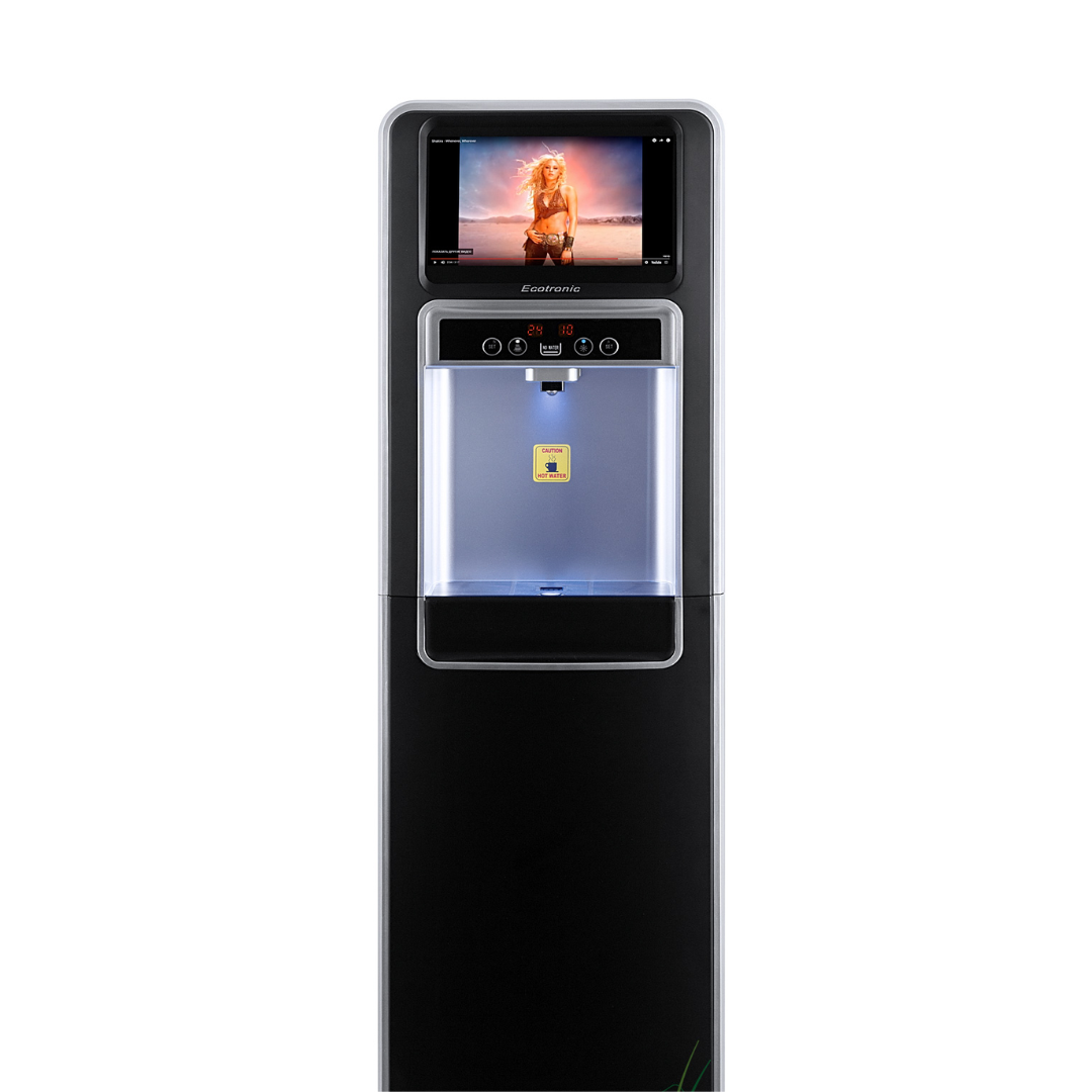 Ecotronic P5-LXAD – кулер с дисплеем для видео, рекламных роликов и прочего медийного контента. С нижней загрузкой бутыли. Оснащен 10,1-дюймовым дисплеем с сенсорным экраном. Работает на базе операционной системы Android, поддерживает подключение через Wi-Fi, по USB и по Bluetooth, загрузку файлов в формате mp4 непосредственно на устройство и просмотр их (видео и звук). Таким образом, кулер становится полноценным рекламным носителем, продолжая выполнять и свои основные функции. Температурный монитор дает возможность задать нужные значения температуры горячей и холодной воды. Двойной комплект кнопок управления: доступны сверху и с лицевой панели. Верхняя кнопка подачи горячей воды с защитой от случайного нажатия (защита от детей). Система нижней загрузки бутыли позволяет эргономично вписать кулер в рабочее пространство. Бутыль легко устанавливать и заменять. На задней панели расположены тумблеры отключения нагрева и отключения дисплея.