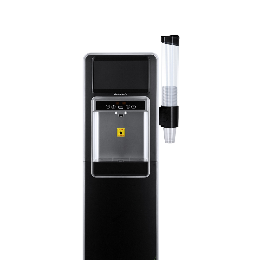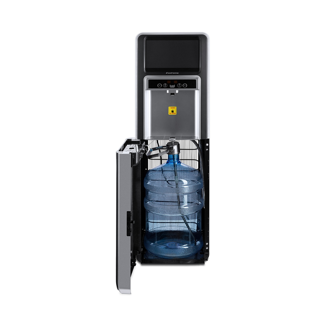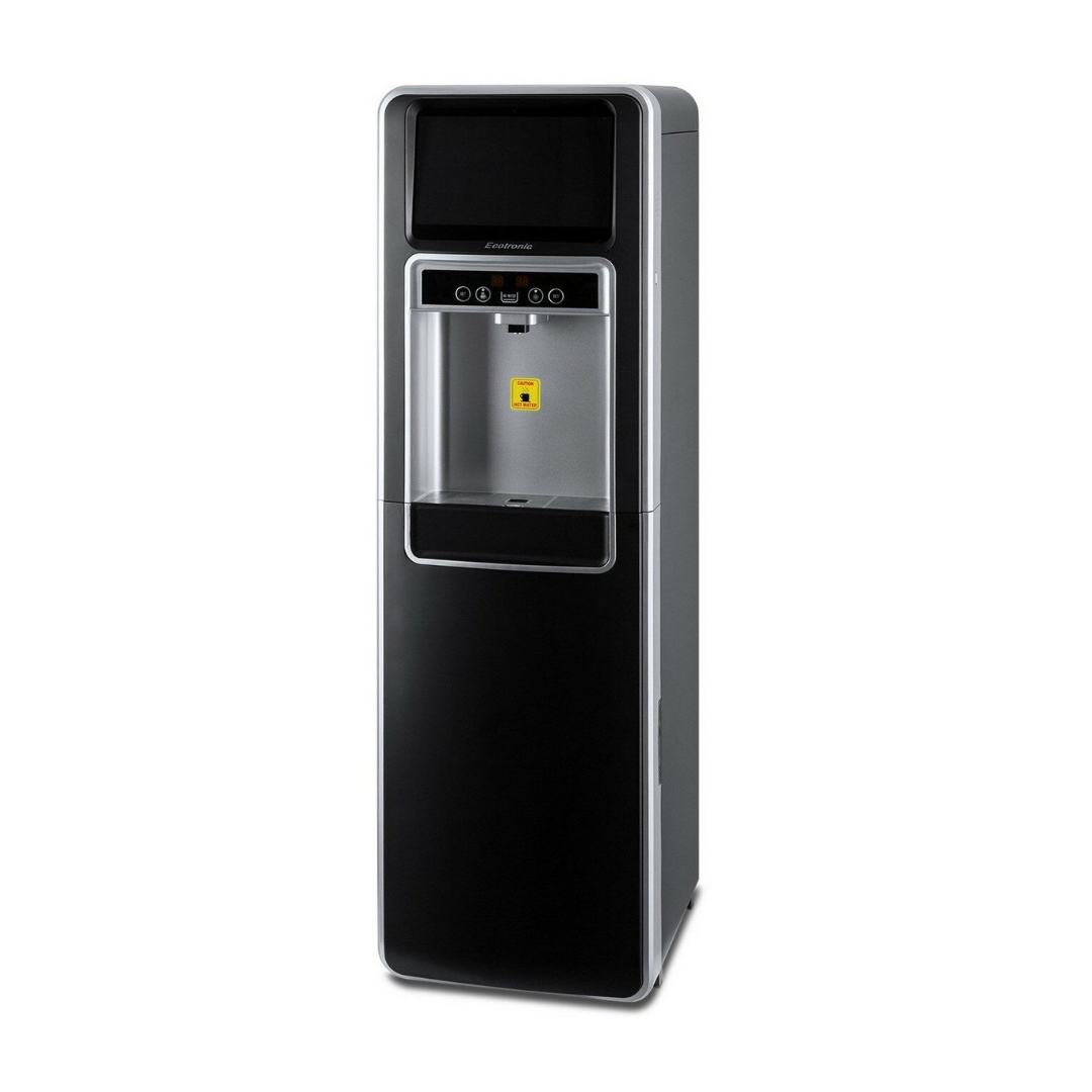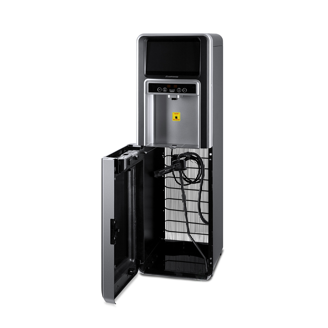 Ecotronic P5-LXAD – кулер с дисплеем для видео, рекламных роликов и прочего медийного контента. С нижней загрузкой бутыли. Оснащен 10,1-дюймовым дисплеем с сенсорным экраном. Работает на базе операционной системы Android, поддерживает подключение через Wi-Fi, по USB и по Bluetooth, загрузку файлов в формате mp4 непосредственно на устройство и просмотр их (видео и звук). Таким образом, кулер становится полноценным рекламным носителем, продолжая выполнять и свои основные функции. Температурный монитор дает возможность задать нужные значения температуры горячей и холодной воды. Двойной комплект кнопок управления: доступны сверху и с лицевой панели. Верхняя кнопка подачи горячей воды с защитой от случайного нажатия (защита от детей). Система нижней загрузки бутыли позволяет эргономично вписать кулер в рабочее пространство. Бутыль легко устанавливать и заменять. На задней панели расположены тумблеры отключения нагрева и отключения дисплея.