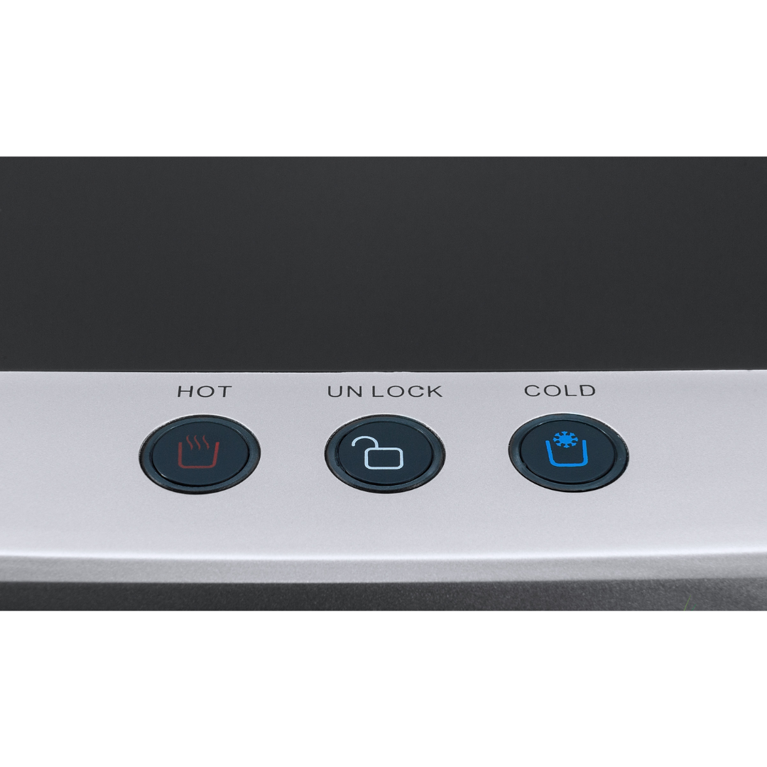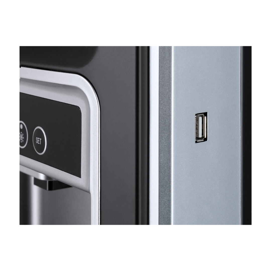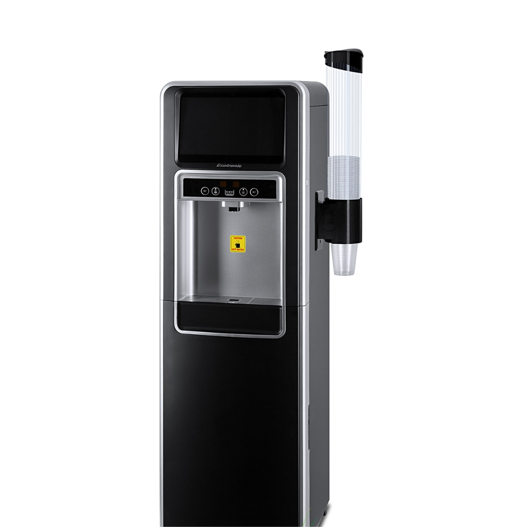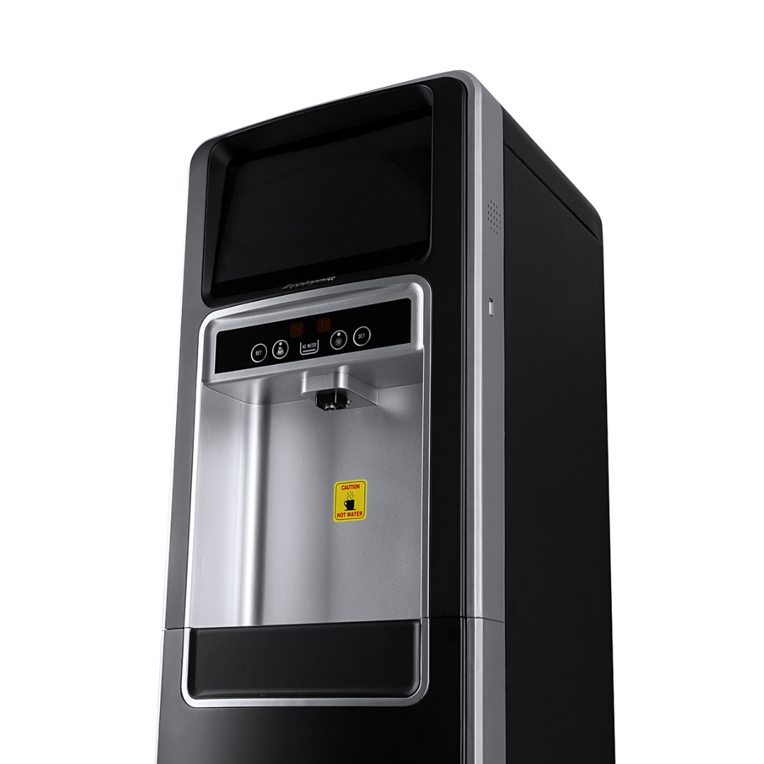 Ecotronic P5-LXAD – кулер с дисплеем для видео, рекламных роликов и прочего медийного контента. С нижней загрузкой бутыли. Оснащен 10,1-дюймовым дисплеем с сенсорным экраном. Работает на базе операционной системы Android, поддерживает подключение через Wi-Fi, по USB и по Bluetooth, загрузку файлов в формате mp4 непосредственно на устройство и просмотр их (видео и звук). Таким образом, кулер становится полноценным рекламным носителем, продолжая выполнять и свои основные функции. Температурный монитор дает возможность задать нужные значения температуры горячей и холодной воды. Двойной комплект кнопок управления: доступны сверху и с лицевой панели. Верхняя кнопка подачи горячей воды с защитой от случайного нажатия (защита от детей). Система нижней загрузки бутыли позволяет эргономично вписать кулер в рабочее пространство. Бутыль легко устанавливать и заменять. На задней панели расположены тумблеры отключения нагрева и отключения дисплея.