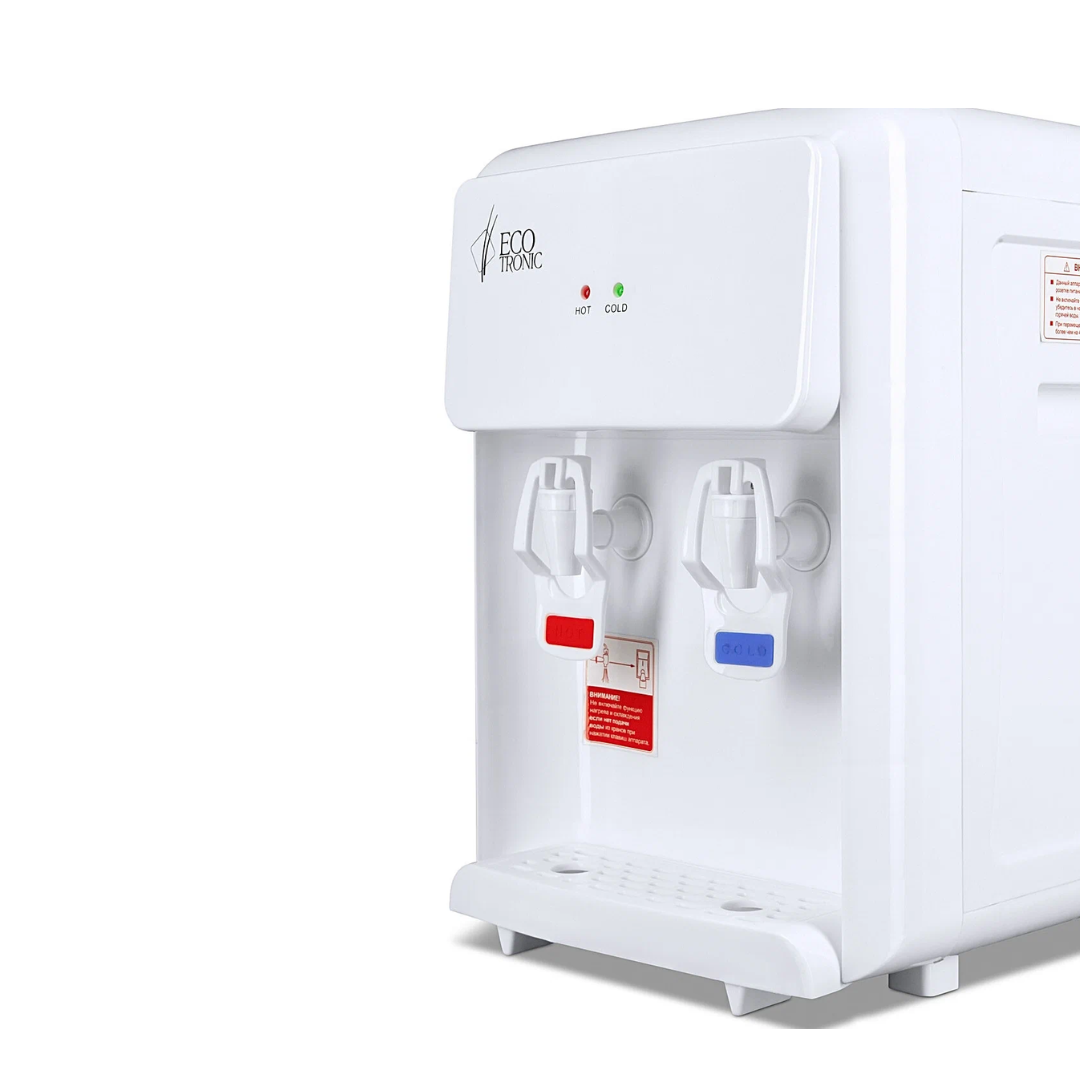 Бюджетный настольный кулер Ecotronic R2-TE: оптимальное соотношение цены и качества. Электронное охлаждение. Индикация режимов нагрева и охлаждения. Корпус белого цвета, краны "нажим кружкой".