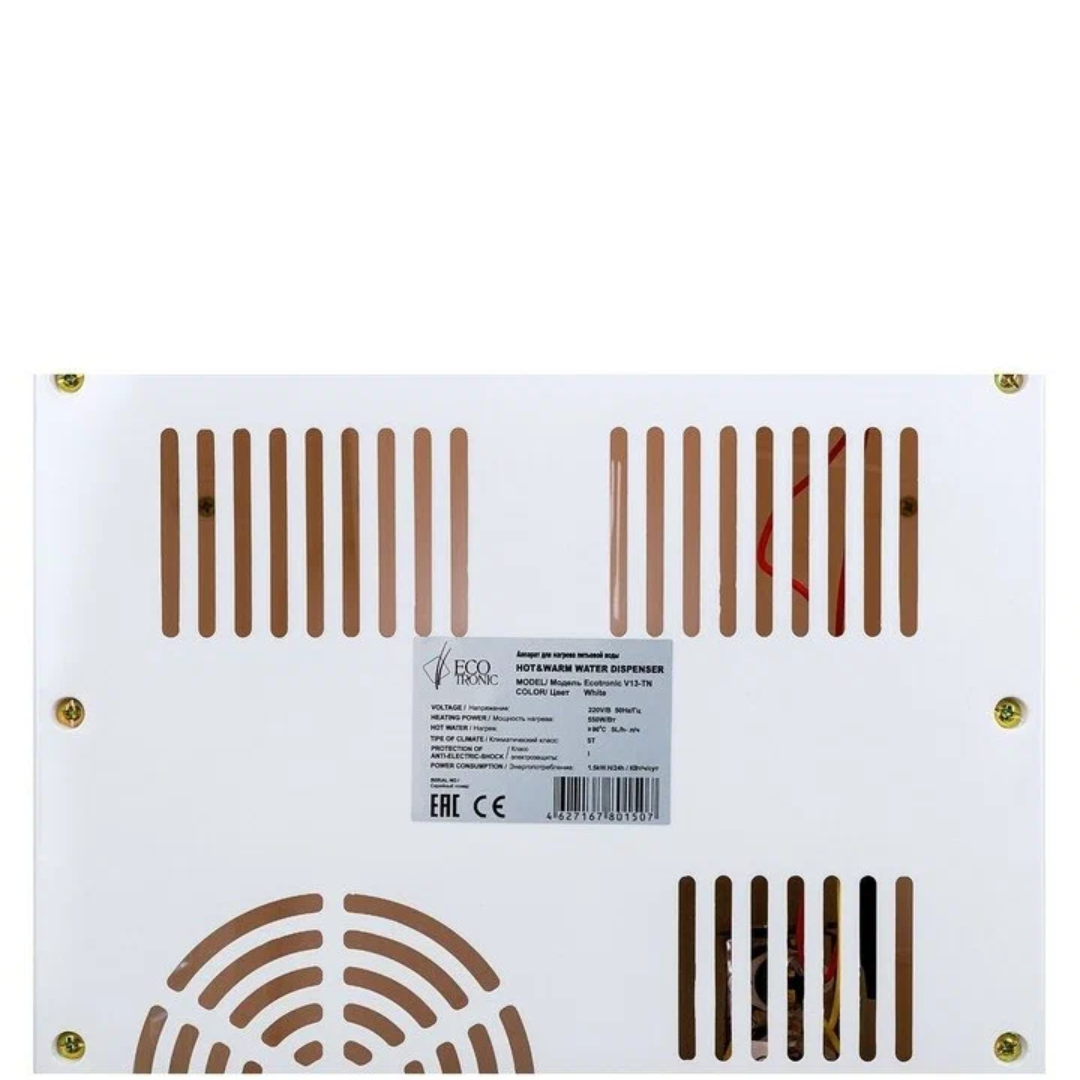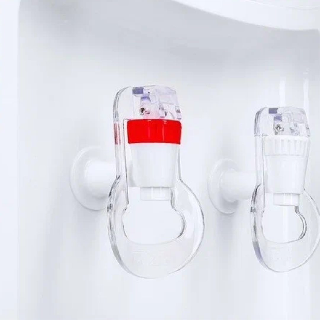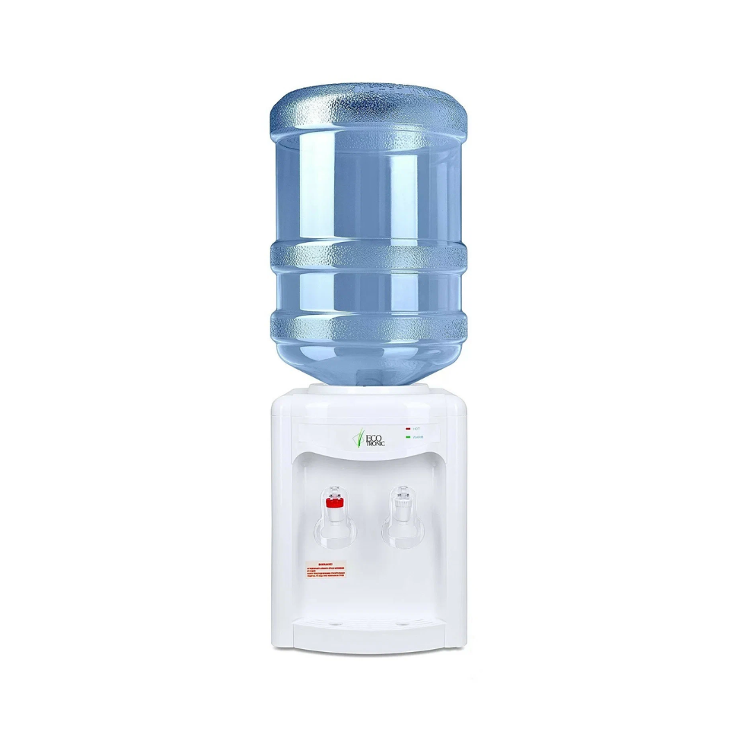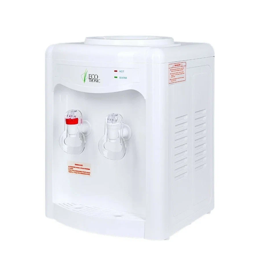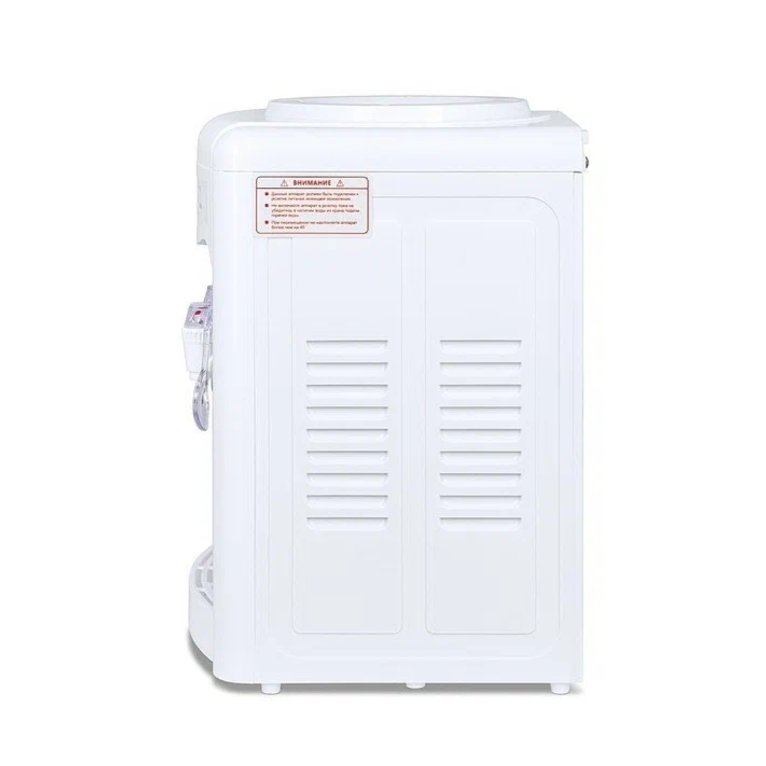 Настольный кулер без охлаждения, только нагрев. Бюджетная модель с доступной ценой. Белый пластиковый корпус, краны "Нажим кружкой": с красной маркировкой для горячей воды и с белой для воды комнатной температуры.