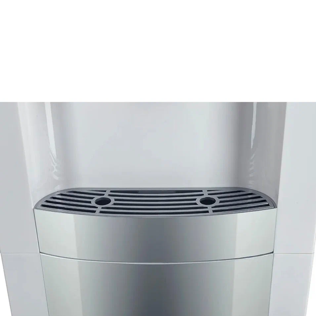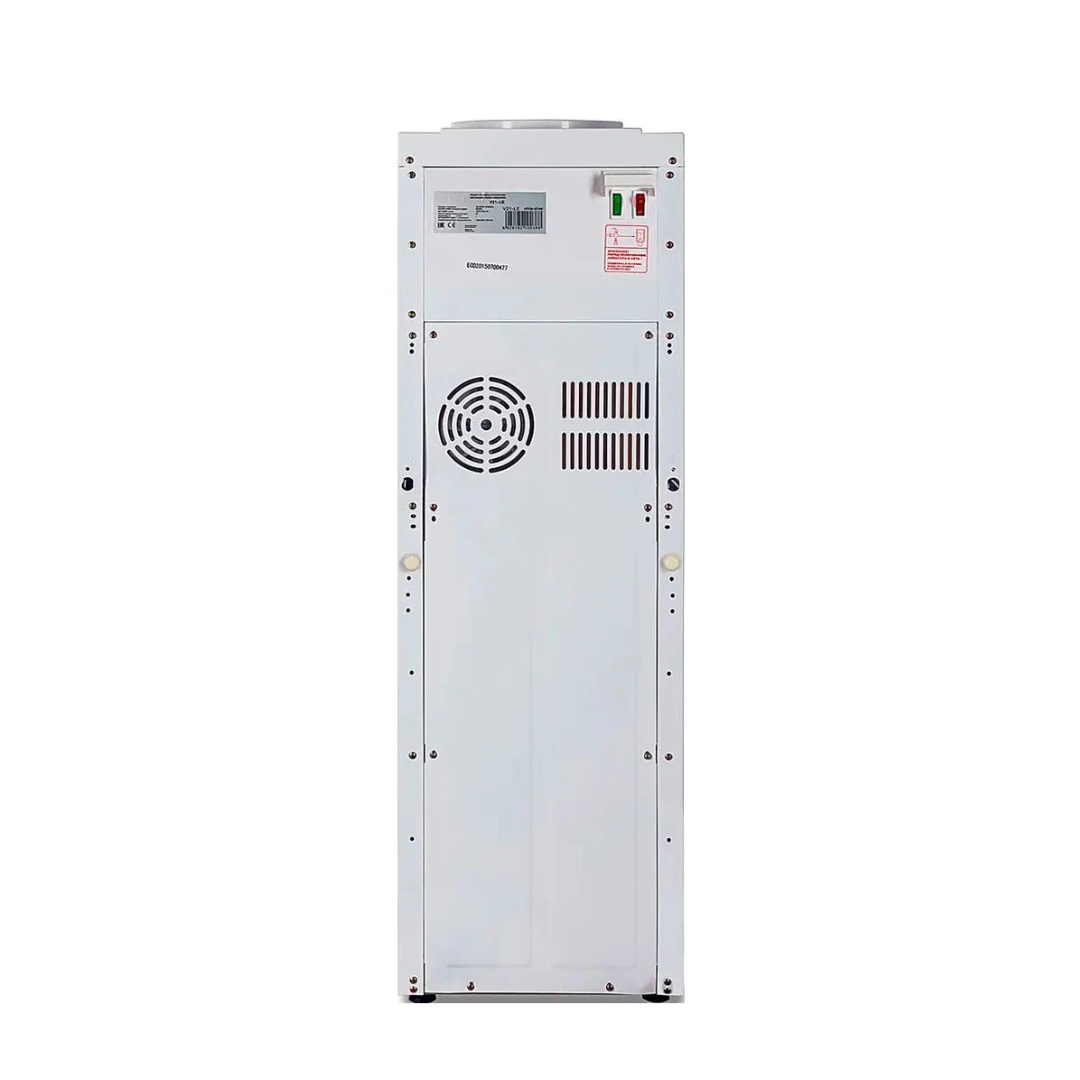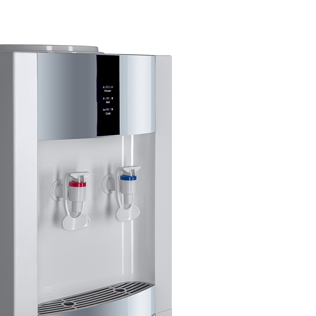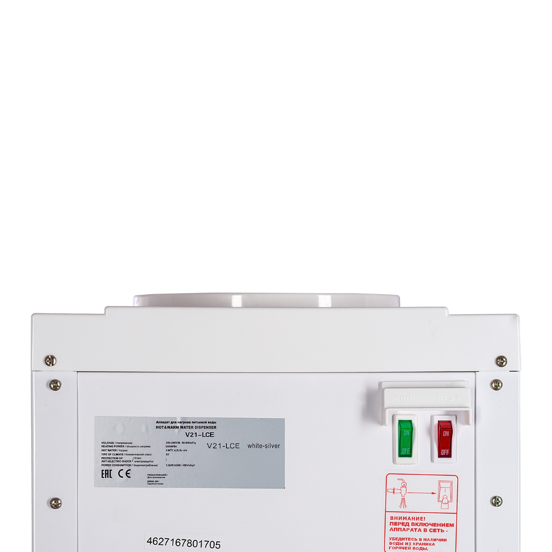 Кулер "Экочип" V21-LCE white+silver со шкафчиком в нижней части. Бюджетная модель. Напольный кулер белого цвета с серебристой вставкой. Электронное охлаждение. Тип кранов подачи воды - "нажим кружкой".
