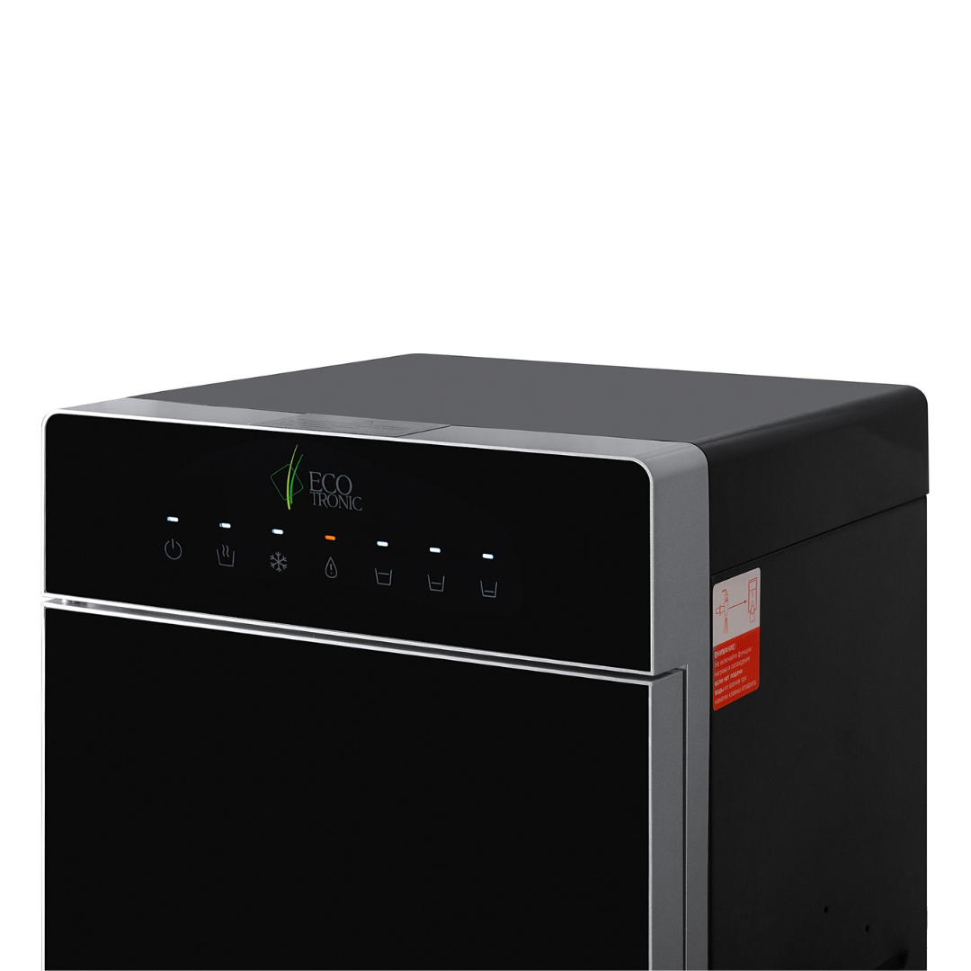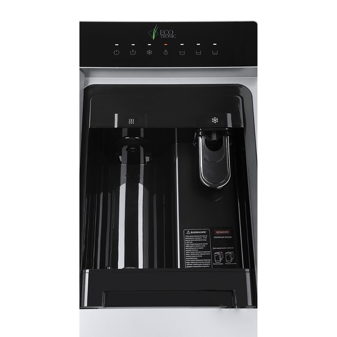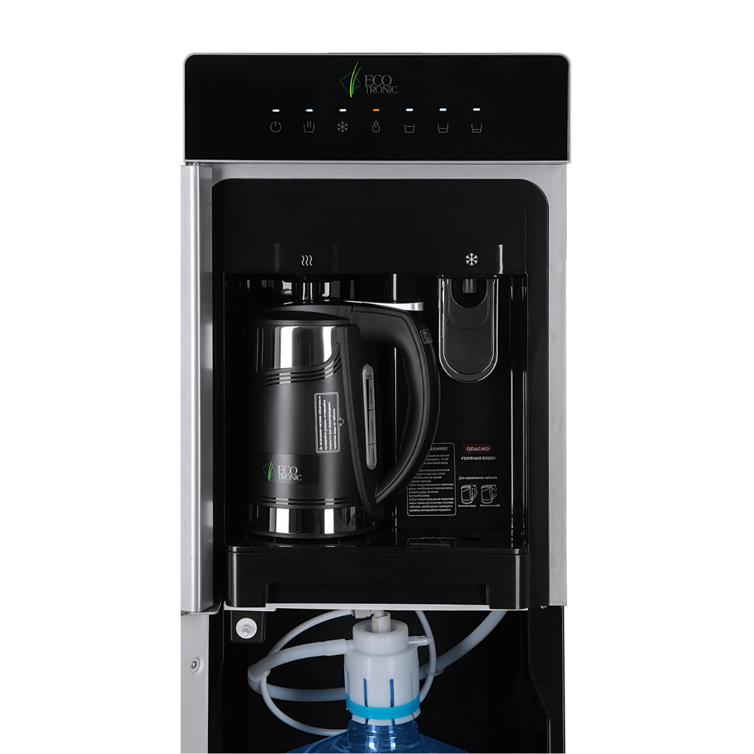 Кулер Ecotronic M15-LXKEM с ЧАЙНИКОМ! Аппарат с нижней загрузкой бутыли, электронное охлаждение. Цвет корпуса: черный с серебряной вставкой. Особенность аппарата, встроенный литровый чайник! Горячая вода нагревается в чайнике,а объем наливаемой воды, регулируется кнопками на передней панели. Разливать горячую воду, так же можно только из чайника! Холодная вода набирается из крана (кран – нажим кружкой). Преимуществом аппарата, является высокая производительность нагрева горячей воды, до 9 литров в час! Температура нагрева воды достигает 99С! Панель управления с возможностью отключения нагрева и/или охлаждения воды. Индикация режимов нагрева/охлаждения и отсутствия воды в бутыли. Тихая работа водяного насоса. Защита от протечек. В боковых панелях имеются отверстия под крепления держателей для стаканов.