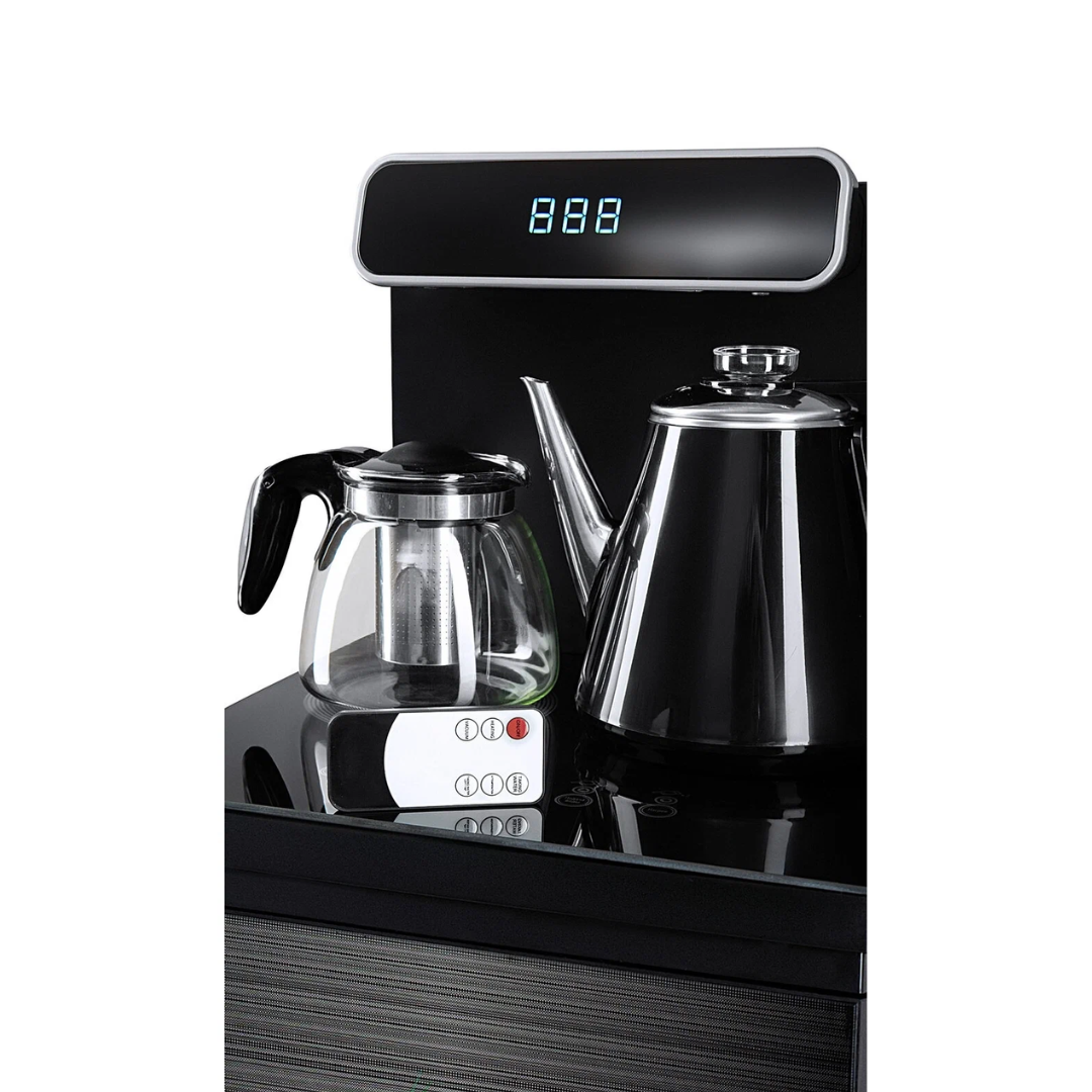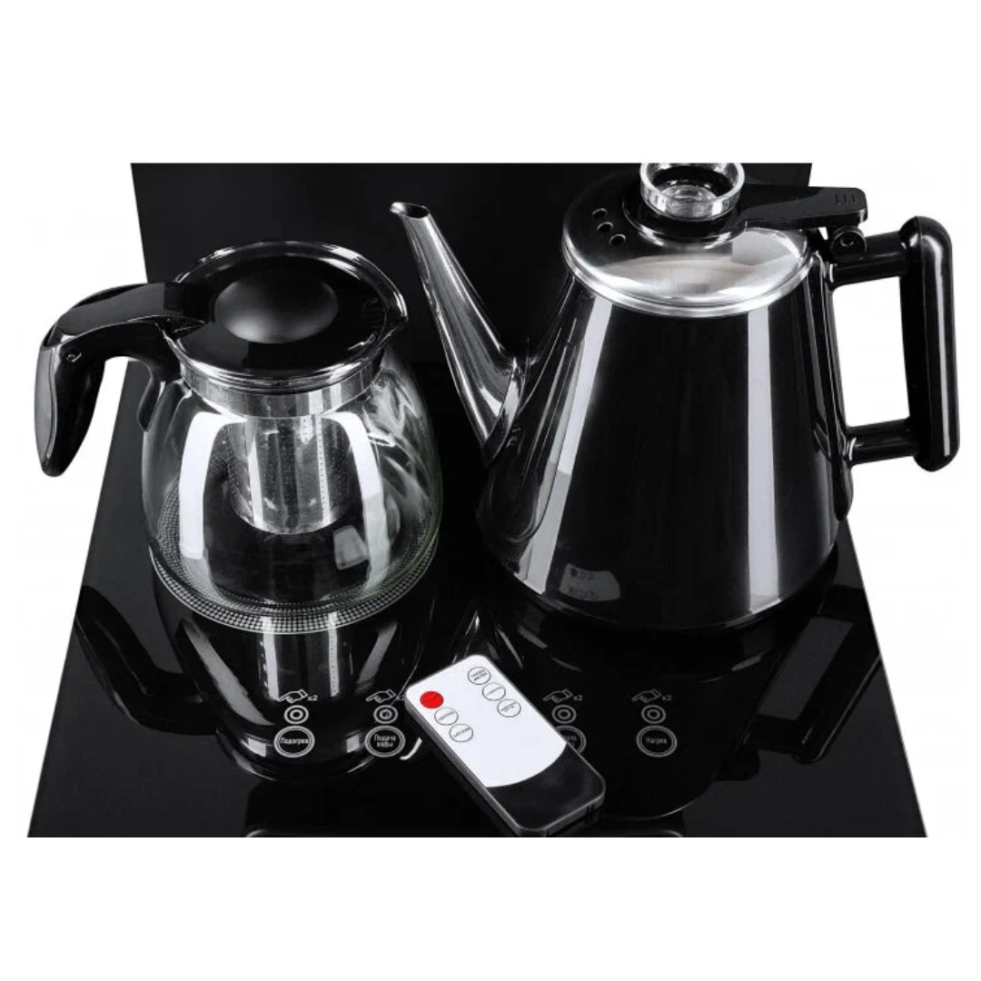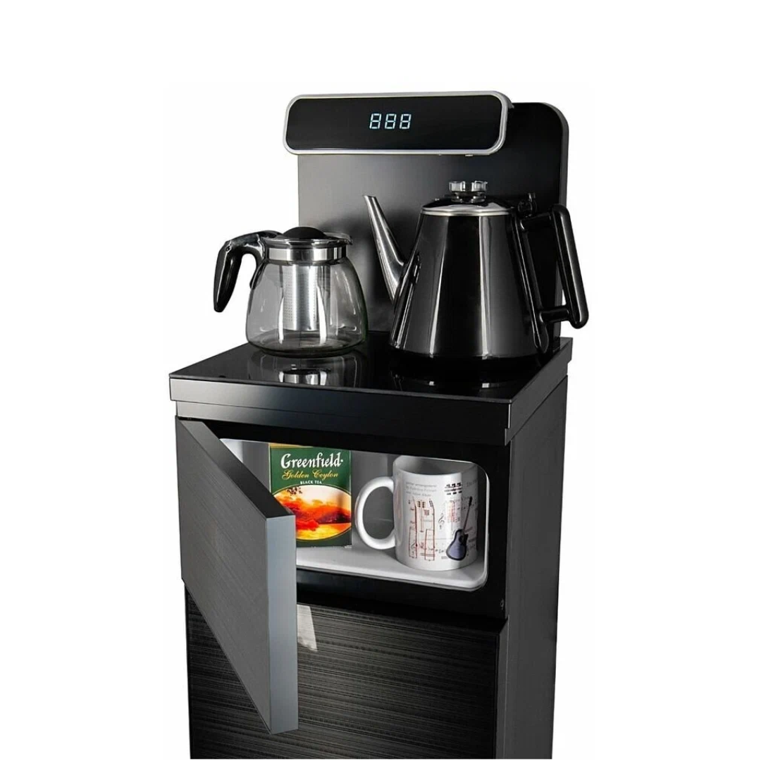 Тиабар Ecotronic TB10-LNR black – это напольный кулер с чайным столиком. Пульт дистанционного управления. Нижняя загрузка бутыли. Два чайника – для кипячения (изотермический) и заварочный. Без охлаждения, только нагрев. Нагрев воды в чайнике до 100°С. Шкафчик для хранения. Многофункциональный тиабар с пультом дистанционного управления, позволяет управлять аппаратом как на удаленном расстоянии до 7 метров, так и с помощью сенсорной панели управления на русском языке. Функция регулировки температуры воды в чайнике позволяет задавать нужную температуру воды в диапазоне от 40°С до 100°С. Функция регулировки времени подачи воды в чайник — возможность задать время подачи воды в чайник (от 18 до 50 сек). Информационный дисплей в верхней части совмещен с кранами подачи воды. Два чайника, для кипячения и заварочный. Заварочному чайнику можно включить режим постоянного подогрева (~ до 60°С). Чайник кипячения изотермический – меньше греется, лучше сохраняет температуру. Подача воды в него возможна без открытия крышки. Нагрев воды в чайнике включается вручную. Автоотключение нагрева при температуре 100°С. В верхней части корпуса есть шкафчик для хранения продуктов. Корпус и передняя панель черного цвета, передняя панель стеклянная. Поверхность чайного столика черная, чайники и кран подачи воды черные с серебристой отделкой.