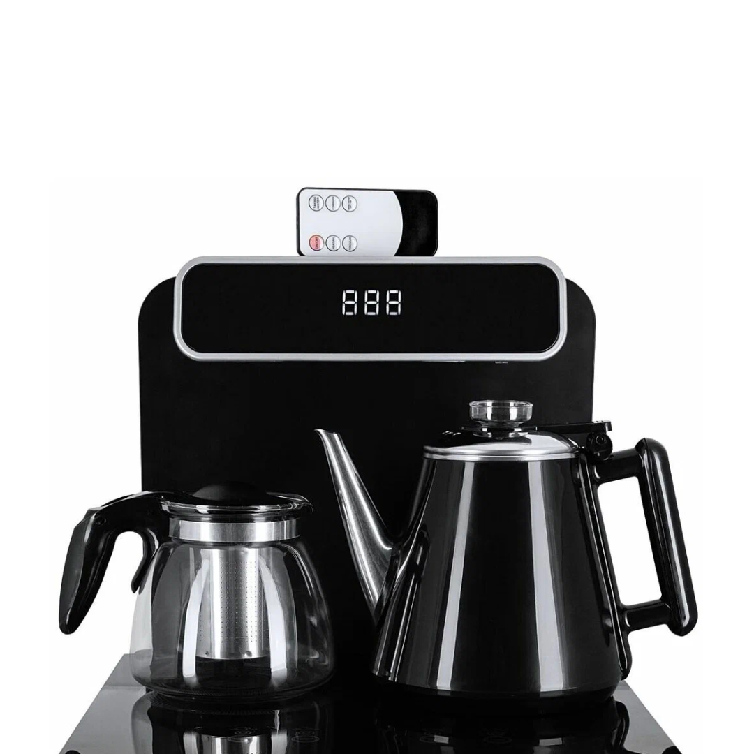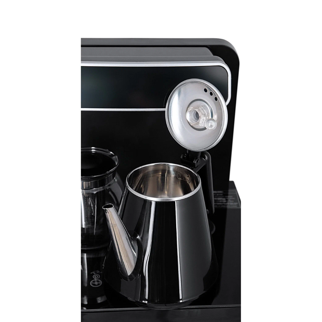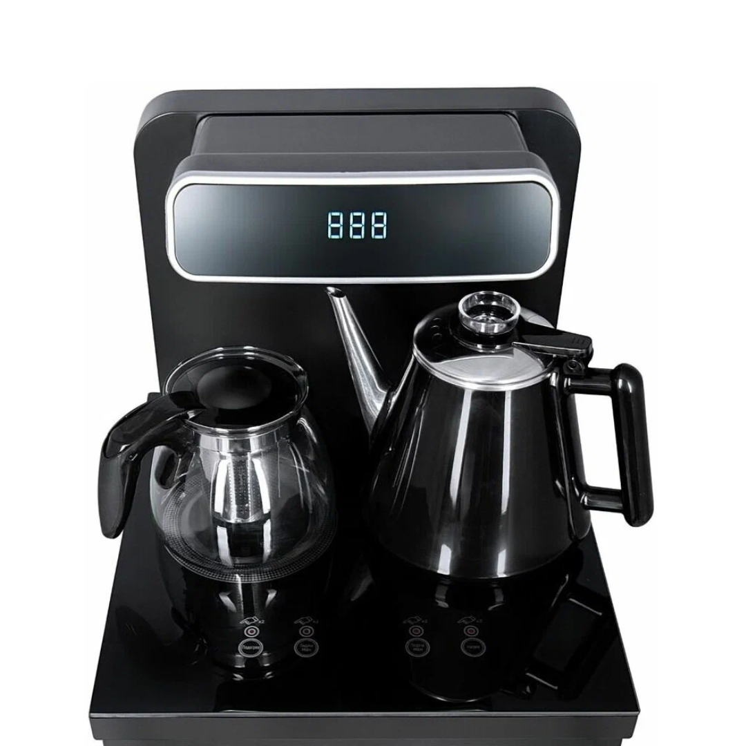 Тиабар Ecotronic TB10-LNR black – это напольный кулер с чайным столиком. Пульт дистанционного управления. Нижняя загрузка бутыли. Два чайника – для кипячения (изотермический) и заварочный. Без охлаждения, только нагрев. Нагрев воды в чайнике до 100°С. Шкафчик для хранения. Многофункциональный тиабар с пультом дистанционного управления, позволяет управлять аппаратом как на удаленном расстоянии до 7 метров, так и с помощью сенсорной панели управления на русском языке. Функция регулировки температуры воды в чайнике позволяет задавать нужную температуру воды в диапазоне от 40°С до 100°С. Функция регулировки времени подачи воды в чайник — возможность задать время подачи воды в чайник (от 18 до 50 сек). Информационный дисплей в верхней части совмещен с кранами подачи воды. Два чайника, для кипячения и заварочный. Заварочному чайнику можно включить режим постоянного подогрева (~ до 60°С). Чайник кипячения изотермический – меньше греется, лучше сохраняет температуру. Подача воды в него возможна без открытия крышки. Нагрев воды в чайнике включается вручную. Автоотключение нагрева при температуре 100°С. В верхней части корпуса есть шкафчик для хранения продуктов. Корпус и передняя панель черного цвета, передняя панель стеклянная. Поверхность чайного столика черная, чайники и кран подачи воды черные с серебристой отделкой.
