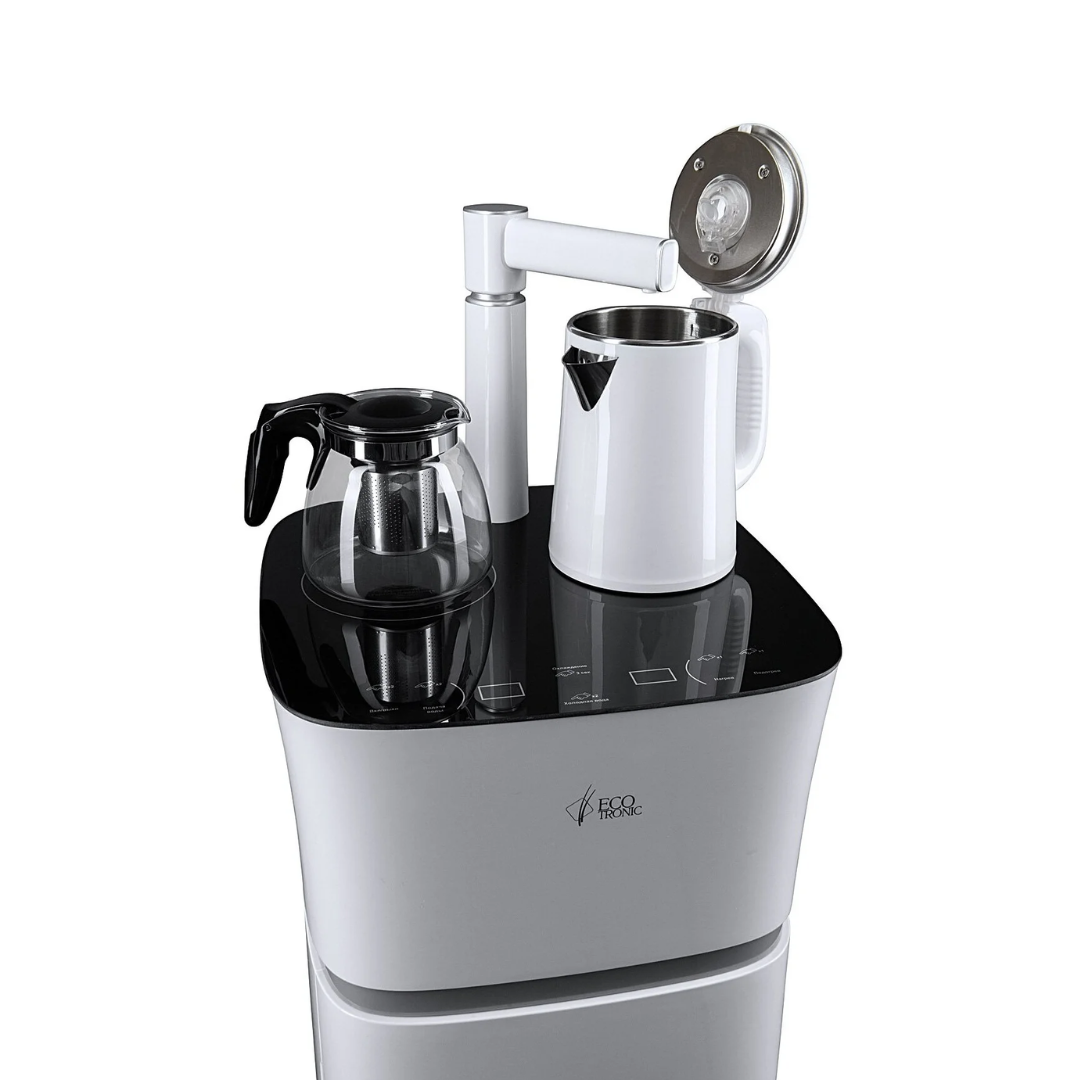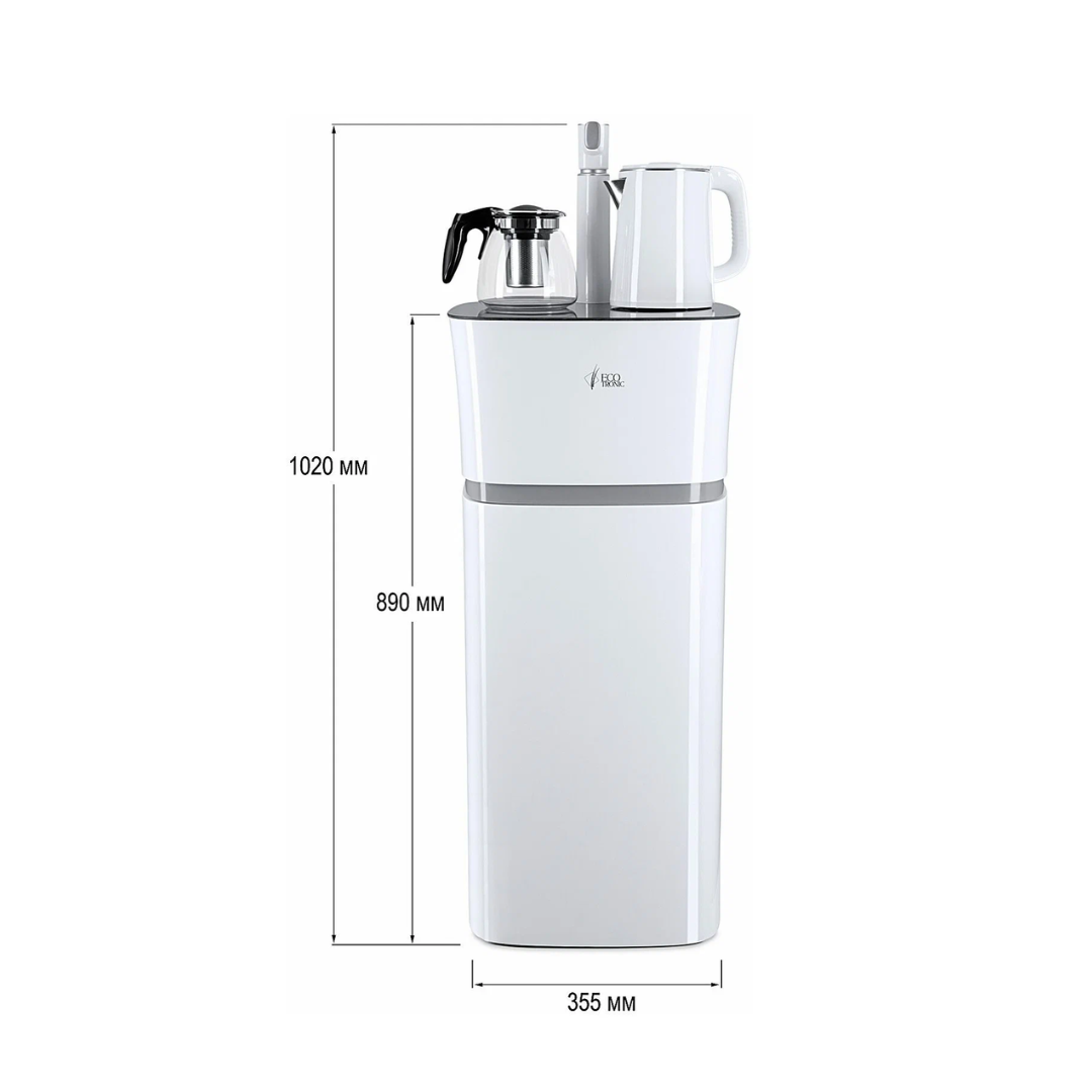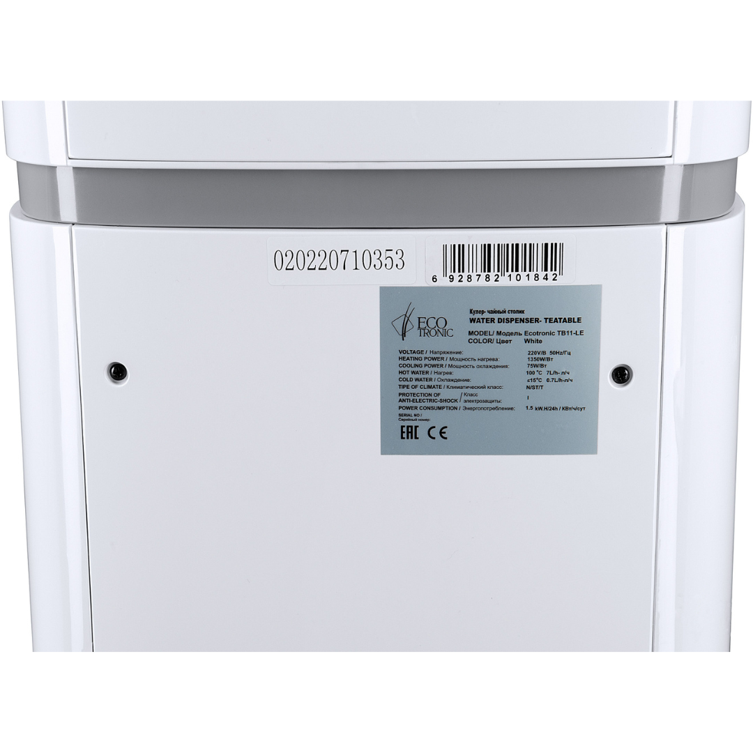 Тиабар Ecotronic TB11-LE white – это напольный кулер с чайным столиком. Нижняя загрузка бутыли, электронное охлаждение. Нагрев воды в чайнике до 100°С. Два чайника – для кипячения (изотермический) и заварочный. Стильный и многофункциональный тиабар: Функция энергосбережения – 8-ми часовой режим работы задан автоматически, либо время работы регулируется от 1 часа до 24 часов. Функция регулировки температуры воды в чайнике позволяет задавать нужную температуру воды в диапазоне от 40°С до 100°С. Функция регулировки времени подачи воды в чайник – возможность задать время подачи воды в чайник (от 18 до 50 сек). На чайном столике расположен кран подачи воды и два чайника, для кипячения и заварочный. Заварочному чайнику можно включить режим постоянного подогрева (~ до 60°С). Чайник кипячения изотермический – меньше греется, лучше сохраняет температуру. Подача воды в него возможна без открытия крышки. Нагрев воды в чайнике включается вручную, либо автоматически в случае использования функции регулировки температуры воды. Автоотключение нагрева при температуре 100°С. Панель управления сенсорная, на русском языке, с информационным дисплеем. Корпус и передняя панель белого цвета. Поверхность чайного столика черная, чайник для кипячения и кран подачи воды белого цвета с серебристой отделкой.