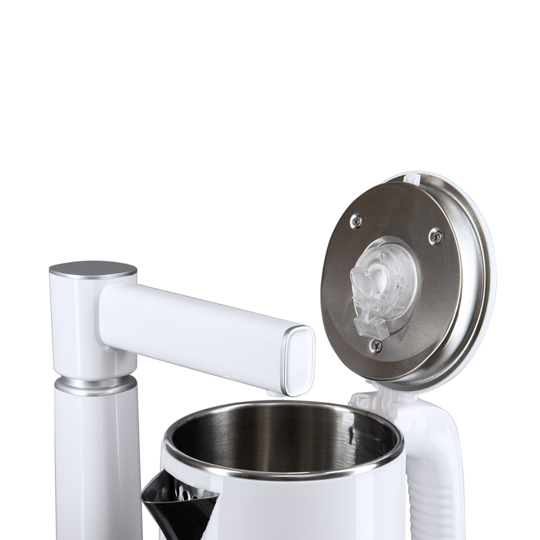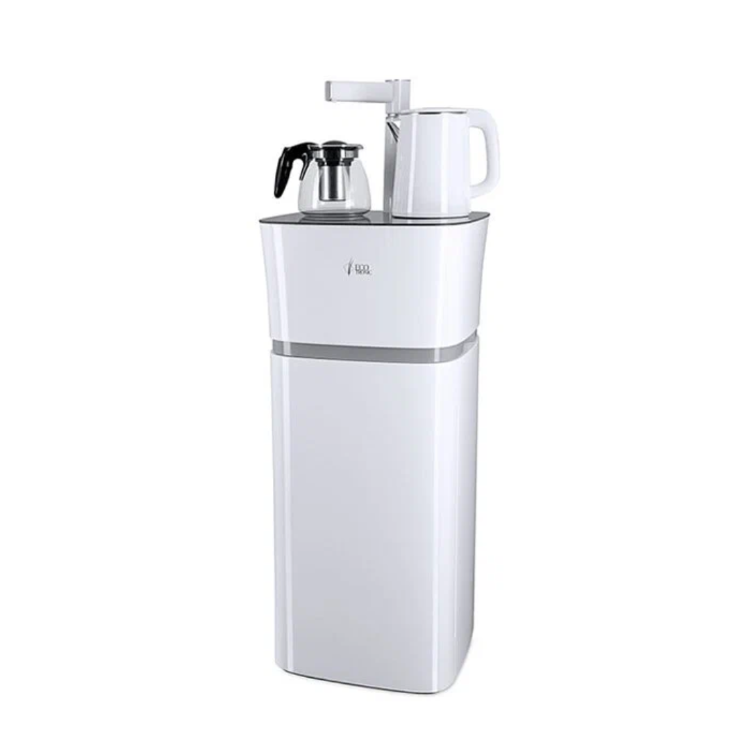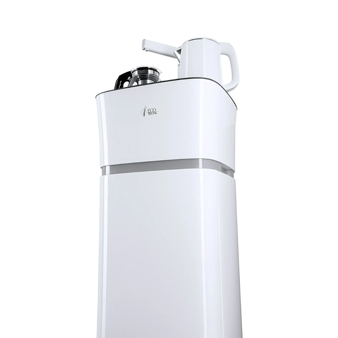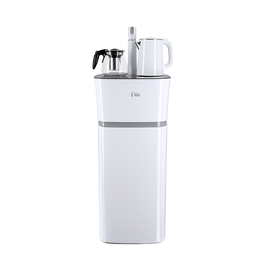 Тиабар Ecotronic TB11-LE white – это напольный кулер с чайным столиком. Нижняя загрузка бутыли, электронное охлаждение. Нагрев воды в чайнике до 100°С. Два чайника – для кипячения (изотермический) и заварочный. Стильный и многофункциональный тиабар: Функция энергосбережения – 8-ми часовой режим работы задан автоматически, либо время работы регулируется от 1 часа до 24 часов. Функция регулировки температуры воды в чайнике позволяет задавать нужную температуру воды в диапазоне от 40°С до 100°С. Функция регулировки времени подачи воды в чайник – возможность задать время подачи воды в чайник (от 18 до 50 сек). На чайном столике расположен кран подачи воды и два чайника, для кипячения и заварочный. Заварочному чайнику можно включить режим постоянного подогрева (~ до 60°С). Чайник кипячения изотермический – меньше греется, лучше сохраняет температуру. Подача воды в него возможна без открытия крышки. Нагрев воды в чайнике включается вручную, либо автоматически в случае использования функции регулировки температуры воды. Автоотключение нагрева при температуре 100°С. Панель управления сенсорная, на русском языке, с информационным дисплеем. Корпус и передняя панель белого цвета. Поверхность чайного столика черная, чайник для кипячения и кран подачи воды белого цвета с серебристой отделкой.