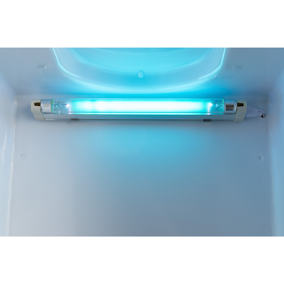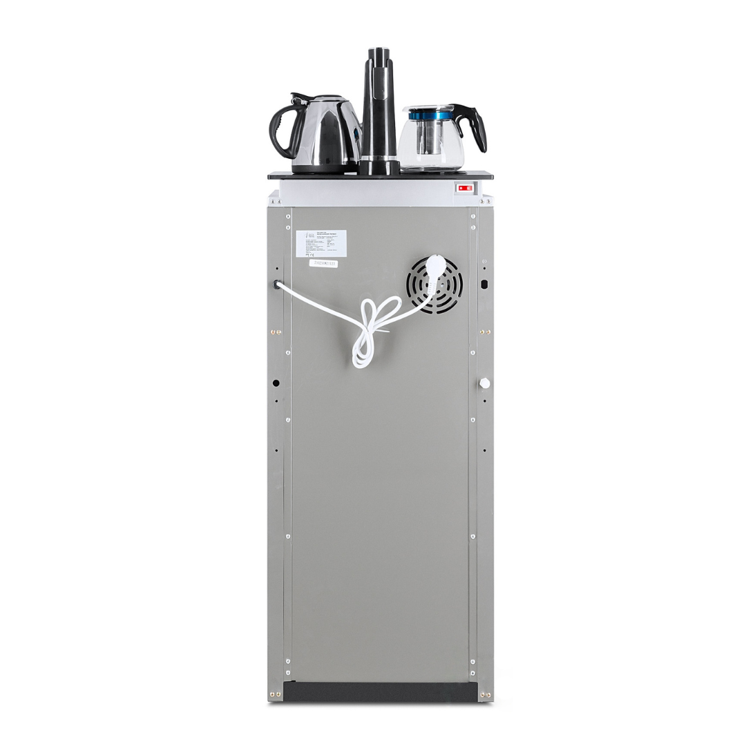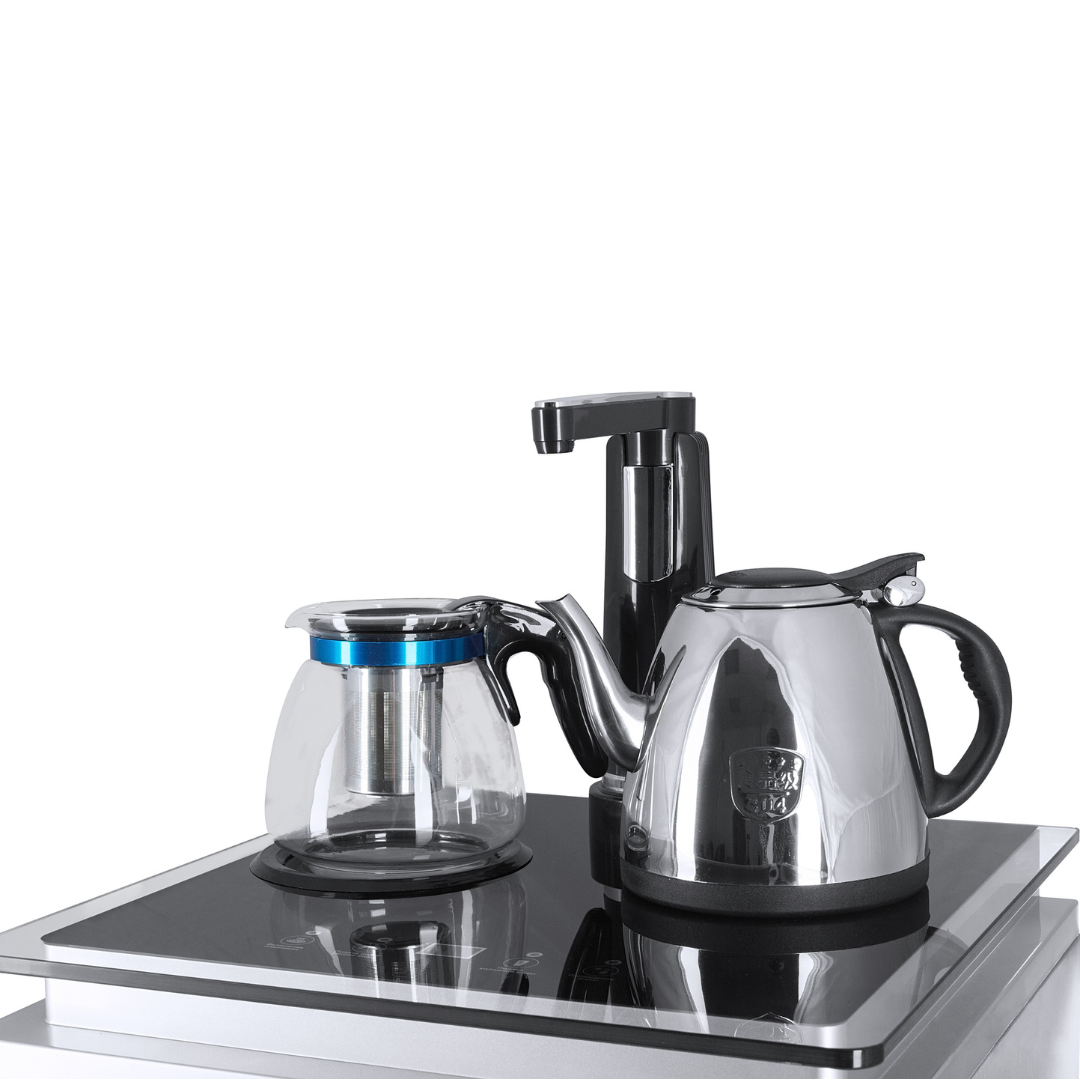 Принципиально НОВЫЙ продукт на рынке! Напольный кулер с чайным столиком Ecotronic TB3-LE UV – это аппарат с нижней загрузкой бутыли, подача воды в котором осуществляется через кран сверху на столике. С функцией стерилизации воды UV-лампой. Ультрафиолетовая озонирующая лампа при необходимости может быть заменена. Совместное воздействие ультрафиолета и озона убивает все штаммы бактерий, грибки, плесень, вирусы, устраняет неприятные запахи. Вода подается в два чайника: обычный и заварной. Заварной чайник устанавливается на поверхность для подогрева – кнопкой на панели управления можно включить поддержание подогрева. В обычном чайнике вода автоматически начинает нагреваться, как только подается в него из крана. Одновременно включается функция стерилизации воды в бутыли. Когда вода достигнет температуры 100°С, нагрев отключится. Температура воды отображается на дисплее. Если вода в чайнике остыла, можно не наполнять его заново, а включить нагрев двойным нажатием кнопки подачи воды. Отдельной кнопкой на панели включается охлаждение воды, после чего поддерживается автоматически, до принудительного отключения. Холодная вода подается из крана по нажатию кнопки "подача холодной воды". Также в конструкции предусмотрен шкафчик для хранения продуктов. Бутыль устанавливается на выкатную полку. Тип охлаждения – электронный. О работе аппарата оповещает информационный дисплей сверху. Панель управления сенсорная, на русском языке. Корпус металлического цвета, передняя панель – черная, с серебристым декором. Поверхность чайного столика из прозрачного стекла, визуально черного цвета. Обратите внимание: чайники предназначены только для использования с этим аппаратом! Поверхность для подогрева заварного чайника не используется для приготовления еды.