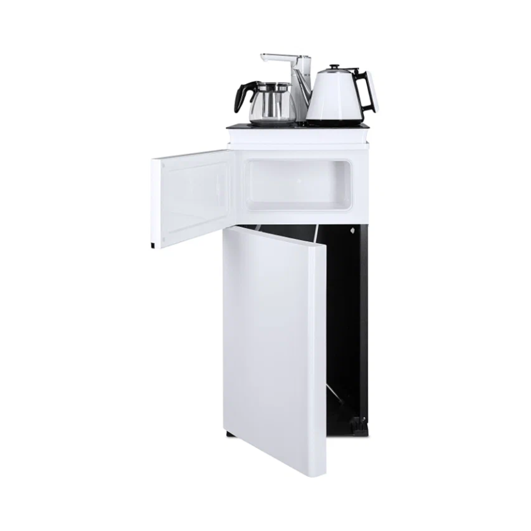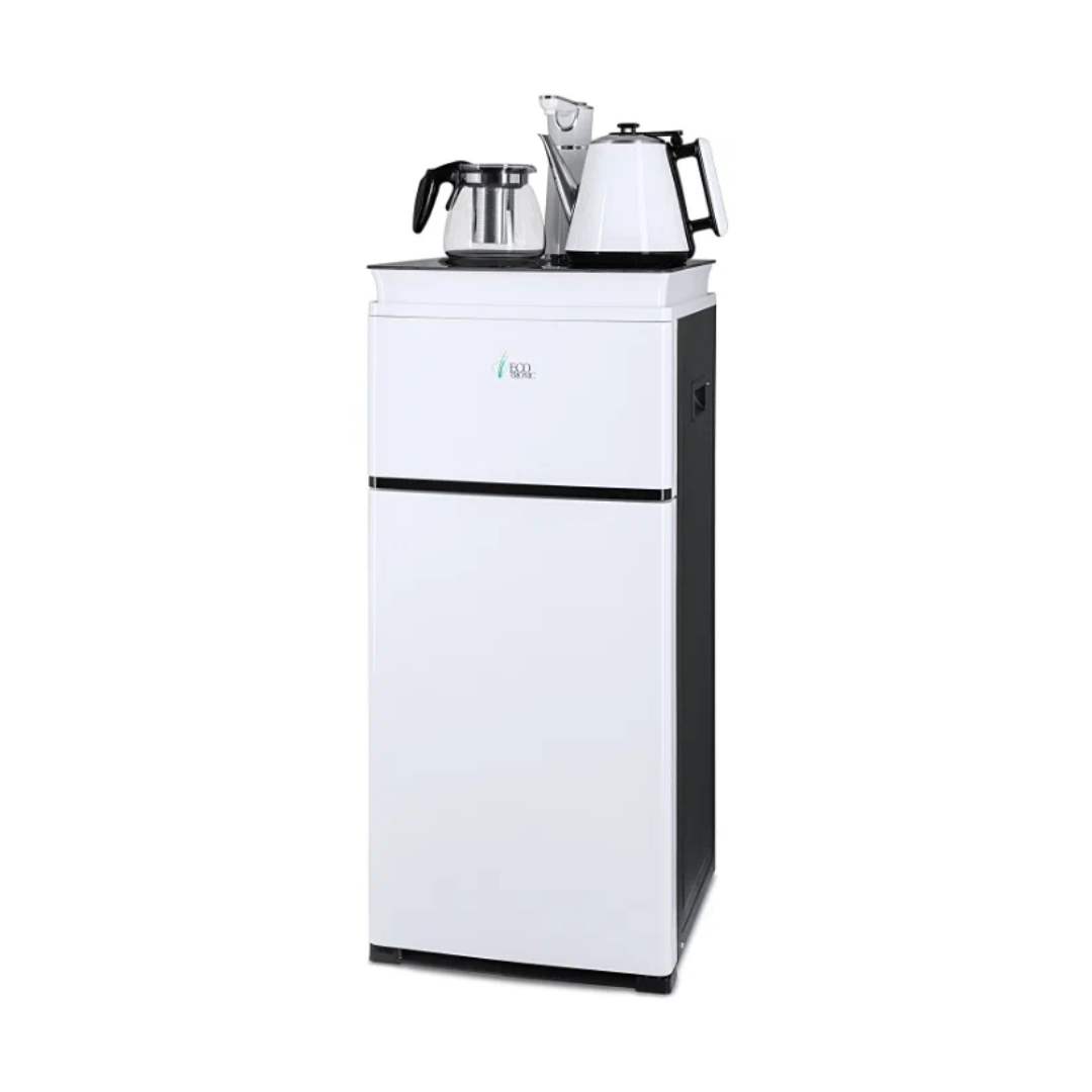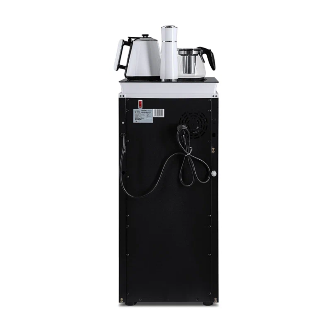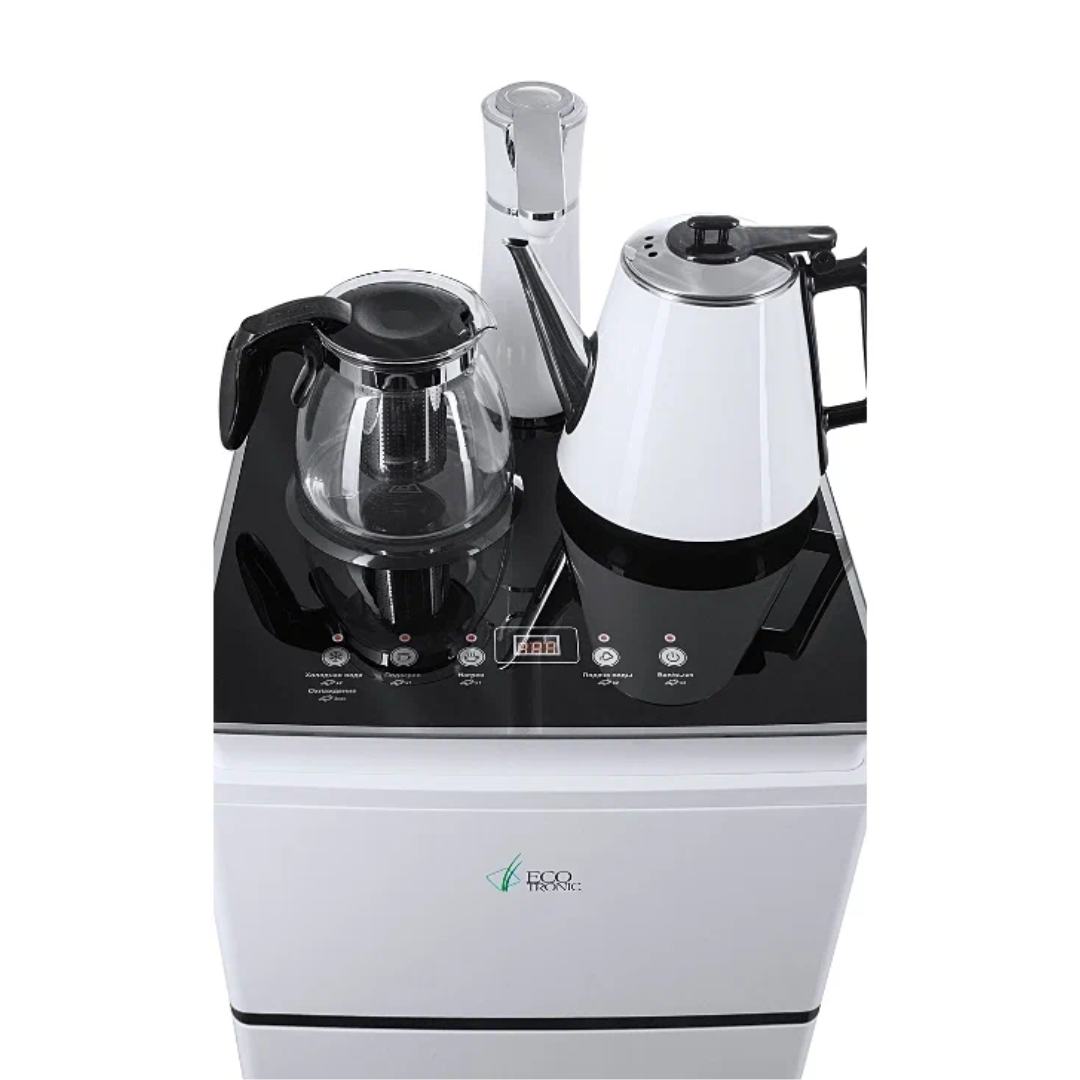 Напольный кулер с чайным столиком Ecotronic TB4-LE – это аппарат с нижней загрузкой бутыли, подача воды в котором осуществляется через кран сверху на столике. Вода подается в два чайника: для кипячения и заварной. Заварной чайник устанавливается на поверхность для подогрева. Температура воды отображается на дисплее. Чайник для кипячения изотермический. Подача воды в него возможна без открытия крышки. Нагрев включается вручную. Сенсорная панель управления с кнопками охлаждения, нагрева, подачи воды для последующего нагревания и подачи охлажденной воды. Отдельной кнопкой можно включить постоянное поддержание подогрева заварочного чайника. Тип охлаждения – электронный. О работе аппарата оповещает информационный дисплей сверху. Панель управления сенсорная, на русском языке. Также в конструкции предусмотрен шкафчик для хранения продуктов. Стильный белый чайник. Передняя панель белого цвета. Корпус сбоку – черного цвета. Поверхность чайного столика черная, с белыми боковыми стенками. Панель управления с серебристыми пиктограммами на сенсорной поверхности. Обратите внимание: чайники предназначены только для использования с тиабарами этой серии! Поверхность для подогрева заварного чайника не используется для приготовления еды.