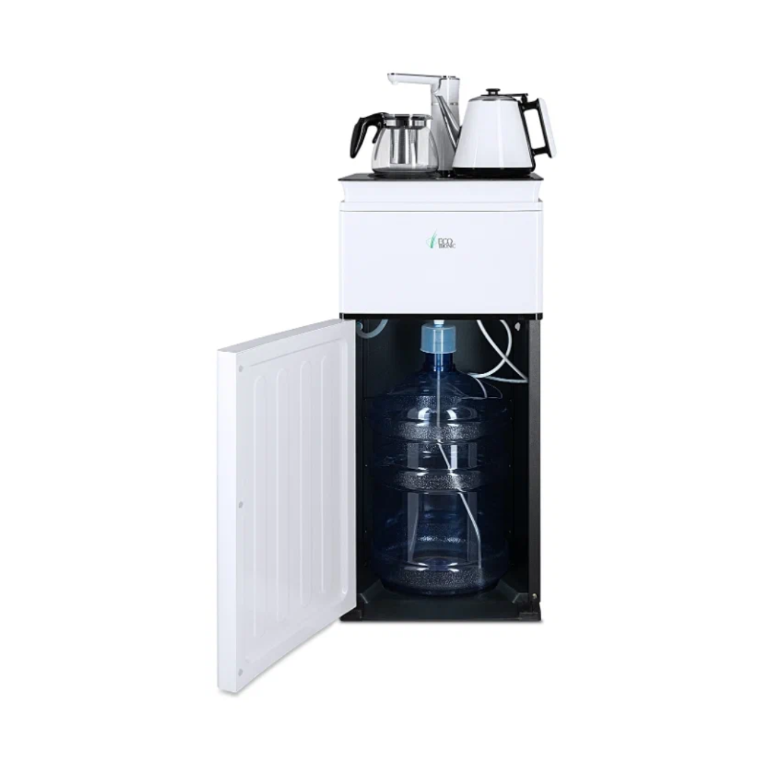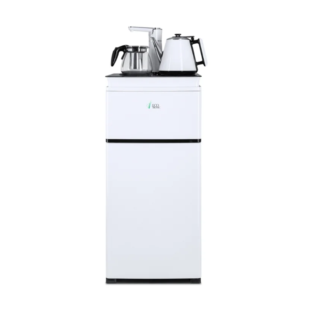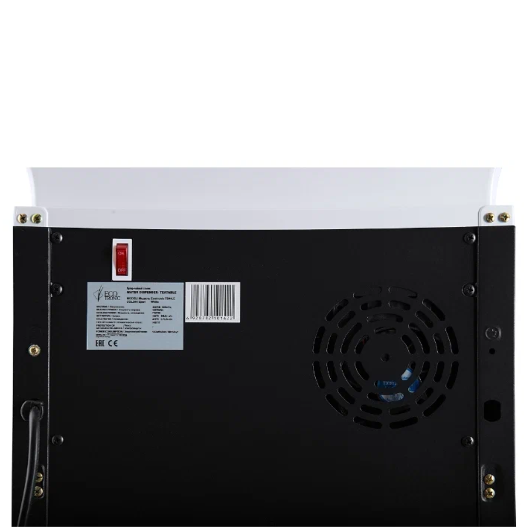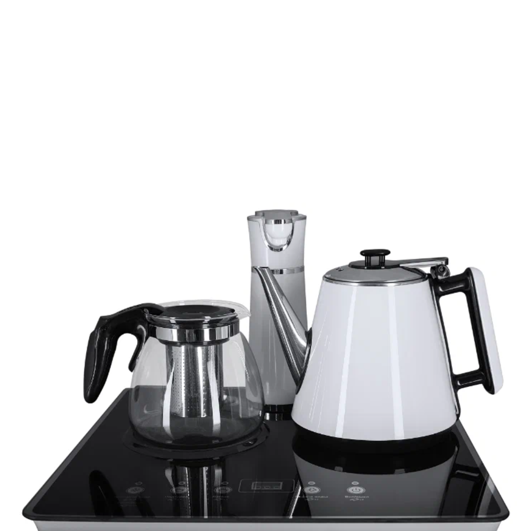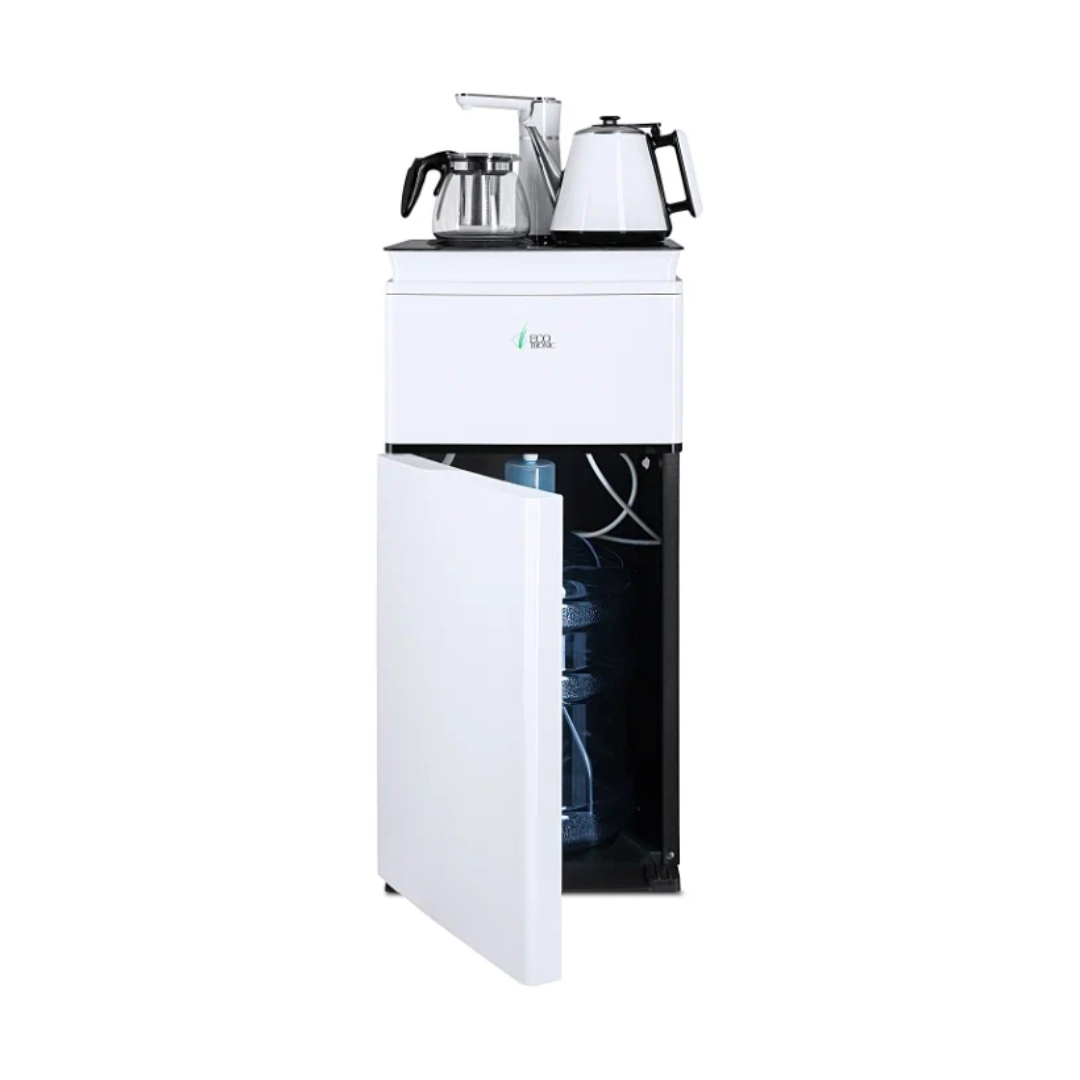 Напольный кулер с чайным столиком Ecotronic TB4-LE – это аппарат с нижней загрузкой бутыли, подача воды в котором осуществляется через кран сверху на столике. Вода подается в два чайника: для кипячения и заварной. Заварной чайник устанавливается на поверхность для подогрева. Температура воды отображается на дисплее. Чайник для кипячения изотермический. Подача воды в него возможна без открытия крышки. Нагрев включается вручную. Сенсорная панель управления с кнопками охлаждения, нагрева, подачи воды для последующего нагревания и подачи охлажденной воды. Отдельной кнопкой можно включить постоянное поддержание подогрева заварочного чайника. Тип охлаждения – электронный. О работе аппарата оповещает информационный дисплей сверху. Панель управления сенсорная, на русском языке. Также в конструкции предусмотрен шкафчик для хранения продуктов. Стильный белый чайник. Передняя панель белого цвета. Корпус сбоку – черного цвета. Поверхность чайного столика черная, с белыми боковыми стенками. Панель управления с серебристыми пиктограммами на сенсорной поверхности. Обратите внимание: чайники предназначены только для использования с тиабарами этой серии! Поверхность для подогрева заварного чайника не используется для приготовления еды.