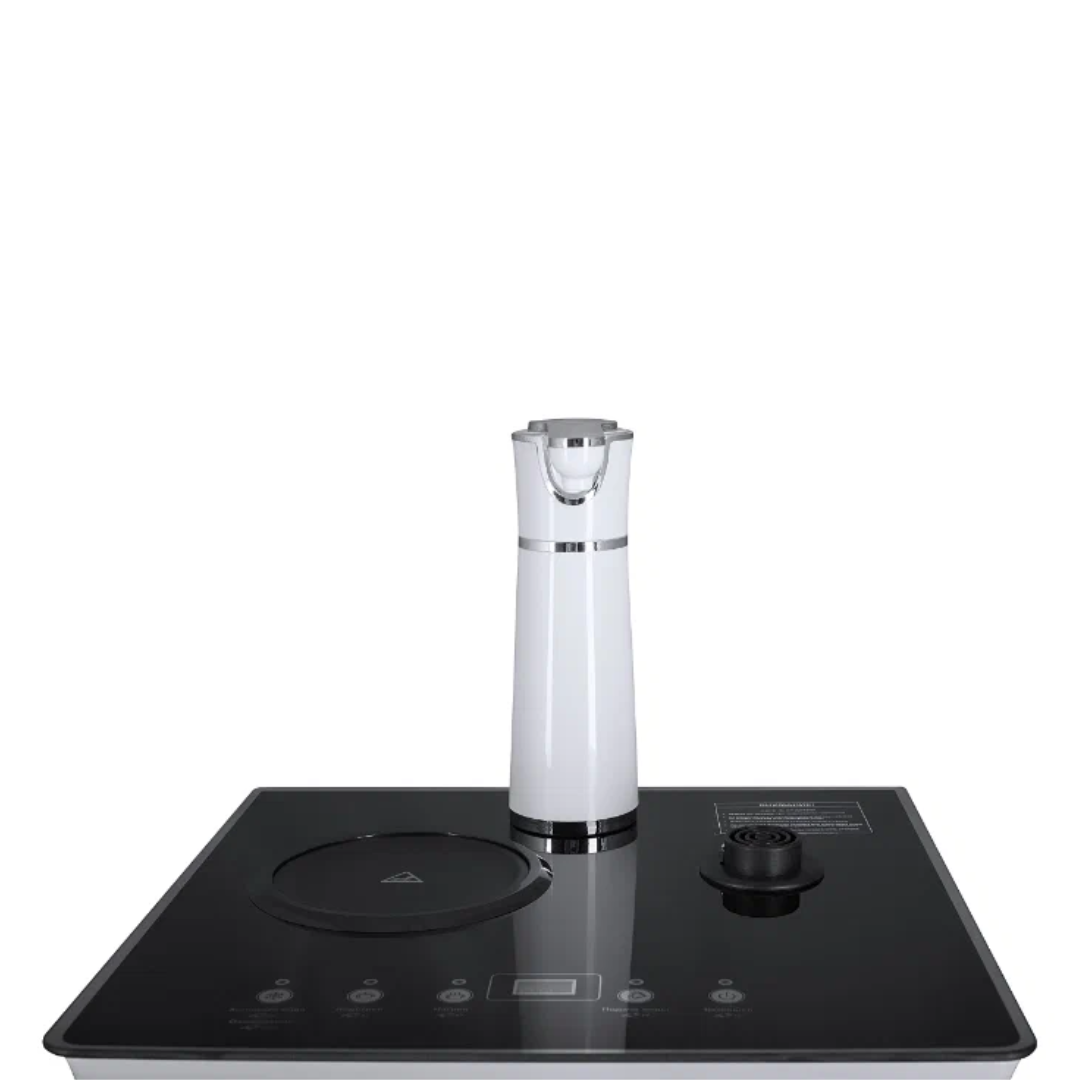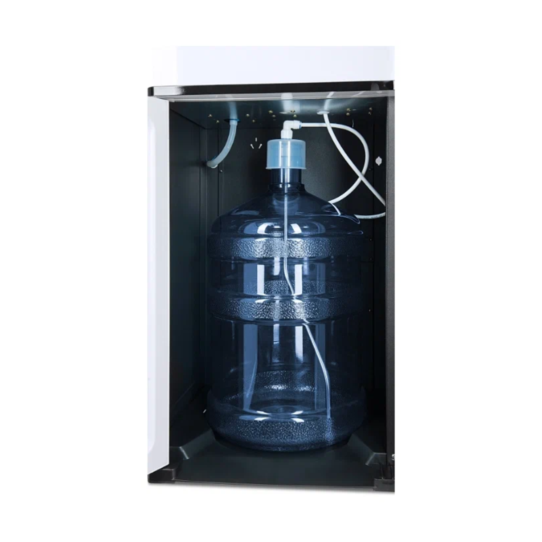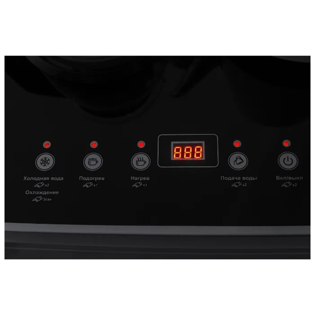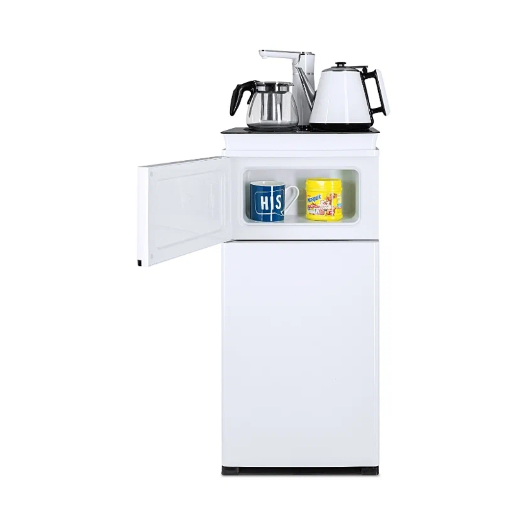 Напольный кулер с чайным столиком Ecotronic TB4-LE – это аппарат с нижней загрузкой бутыли, подача воды в котором осуществляется через кран сверху на столике. Вода подается в два чайника: для кипячения и заварной. Заварной чайник устанавливается на поверхность для подогрева. Температура воды отображается на дисплее. Чайник для кипячения изотермический. Подача воды в него возможна без открытия крышки. Нагрев включается вручную. Сенсорная панель управления с кнопками охлаждения, нагрева, подачи воды для последующего нагревания и подачи охлажденной воды. Отдельной кнопкой можно включить постоянное поддержание подогрева заварочного чайника. Тип охлаждения – электронный. О работе аппарата оповещает информационный дисплей сверху. Панель управления сенсорная, на русском языке. Также в конструкции предусмотрен шкафчик для хранения продуктов. Стильный белый чайник. Передняя панель белого цвета. Корпус сбоку – черного цвета. Поверхность чайного столика черная, с белыми боковыми стенками. Панель управления с серебристыми пиктограммами на сенсорной поверхности. Обратите внимание: чайники предназначены только для использования с тиабарами этой серии! Поверхность для подогрева заварного чайника не используется для приготовления еды.
