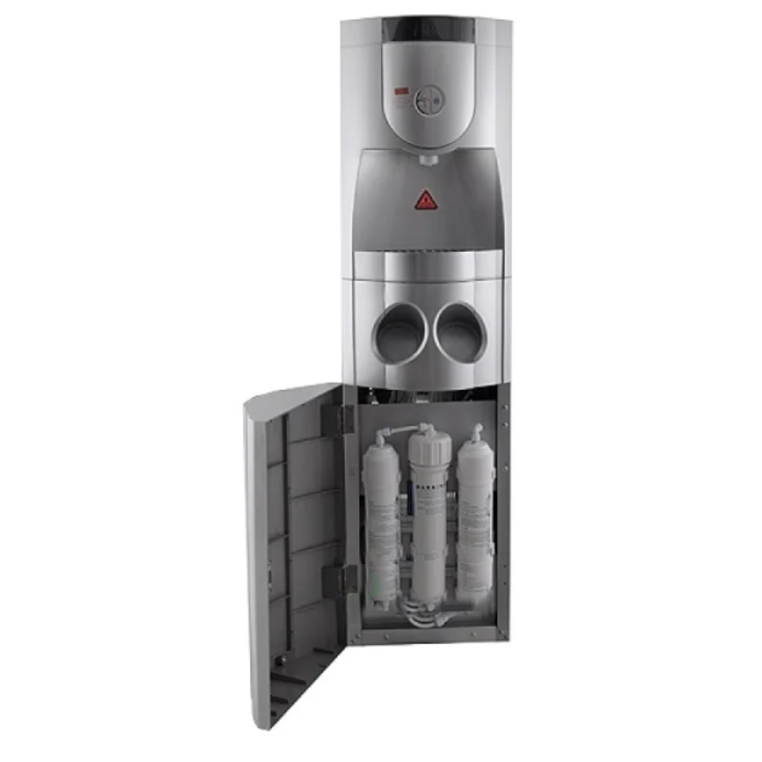Напольный пурифайер с 3-х ступенчатой UF фильтрацией. Электромагнитные кнопки подачи воды. Функция защиты от детей с возможностью отключения на плате управления. Два встроенных стаканодержателя. Дополнительная защита внешнего нагревателя.