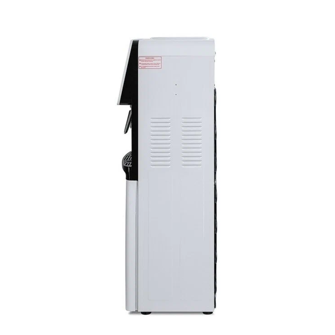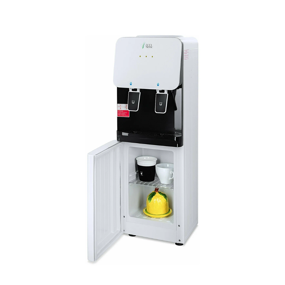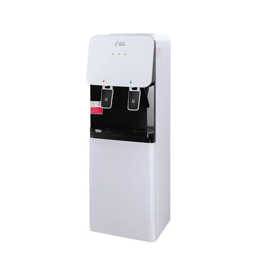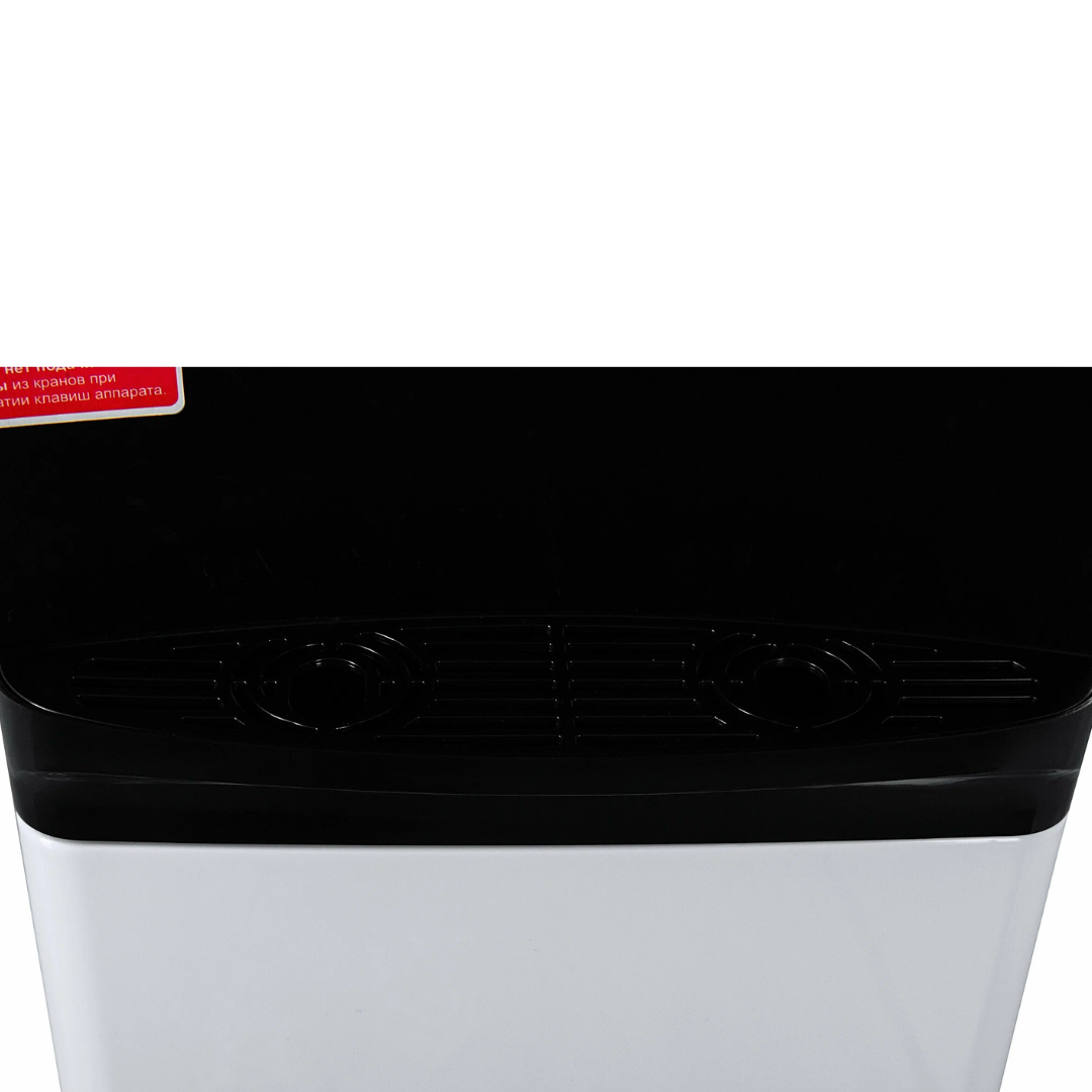 Компактный раздатчик для воды без нагрева и охлаждения. С небольшим шкафчиком в нижней части. Корпус белого цвета с черной вставкой в области кранов подачи воды. Без подключения к сети. Краны «нажим кружкой». Передняя панель сверху имеет широкое ровное пространство, подходящее для брендирования и нанесения логотипа.