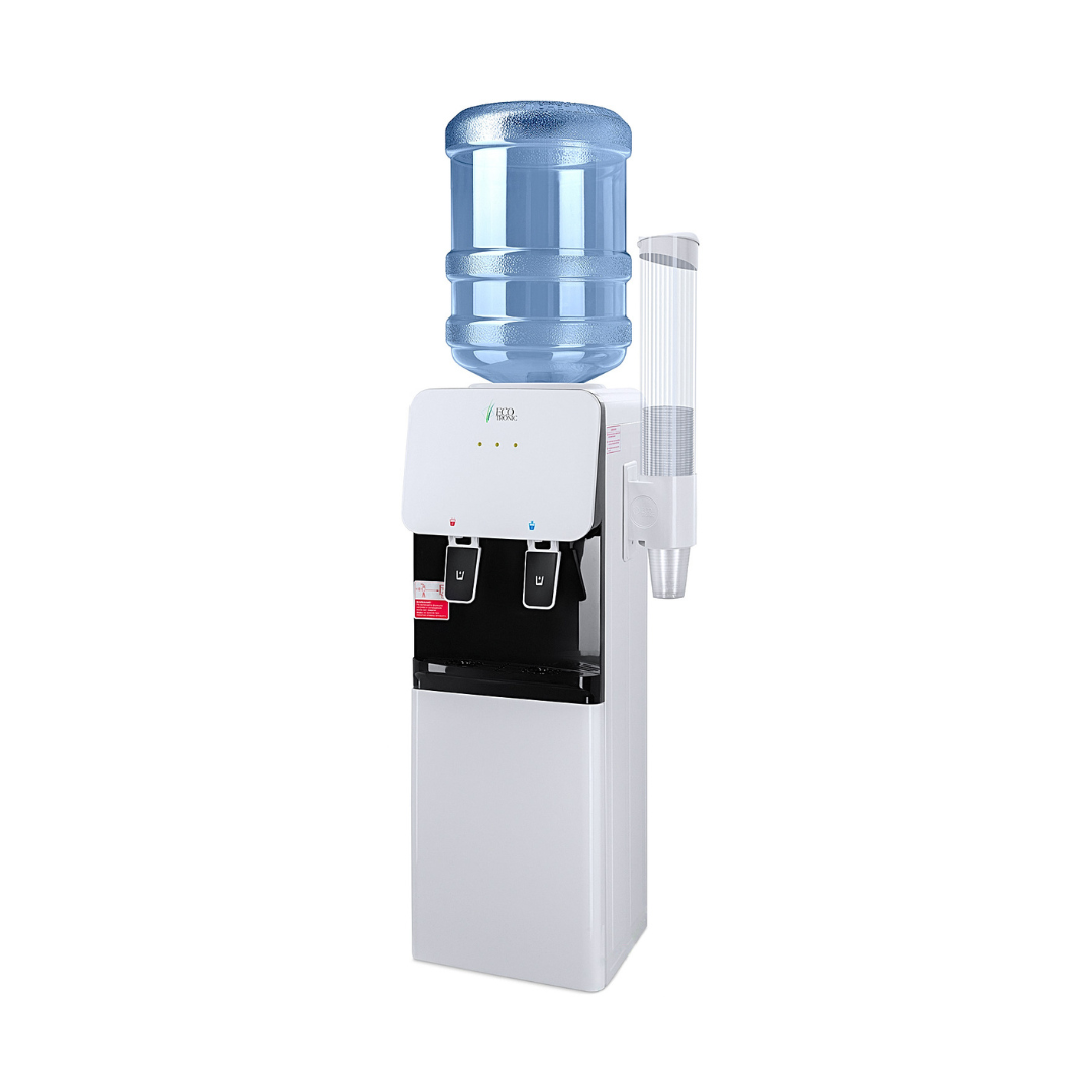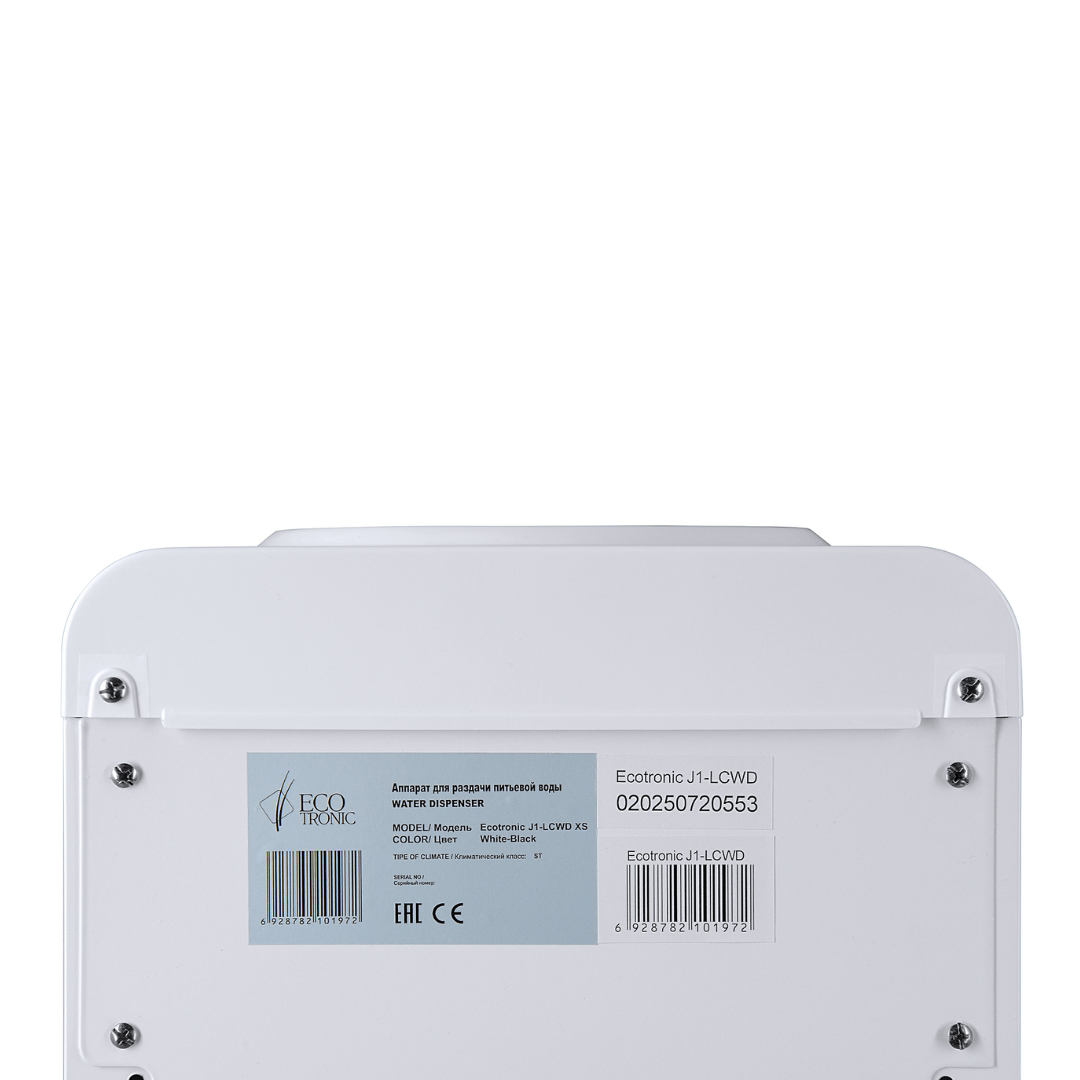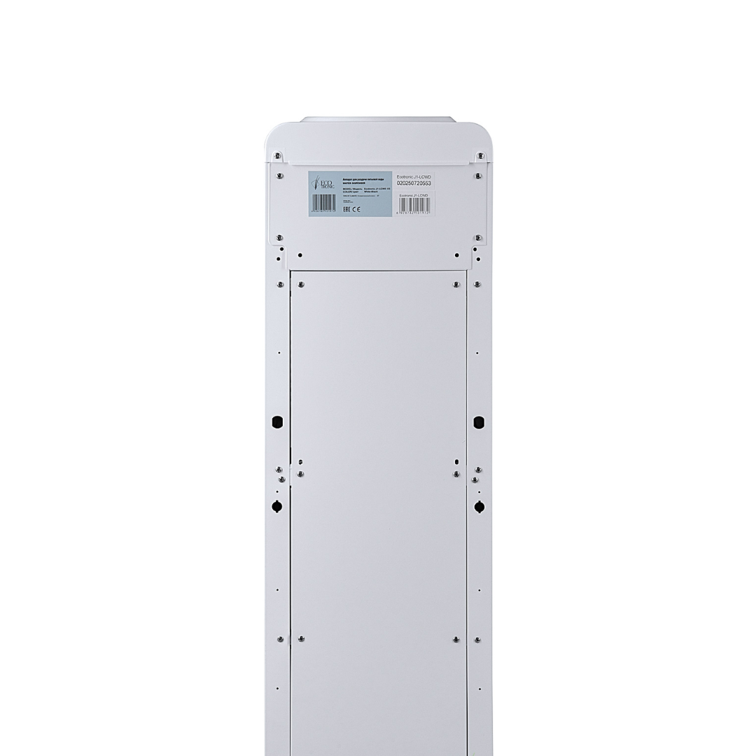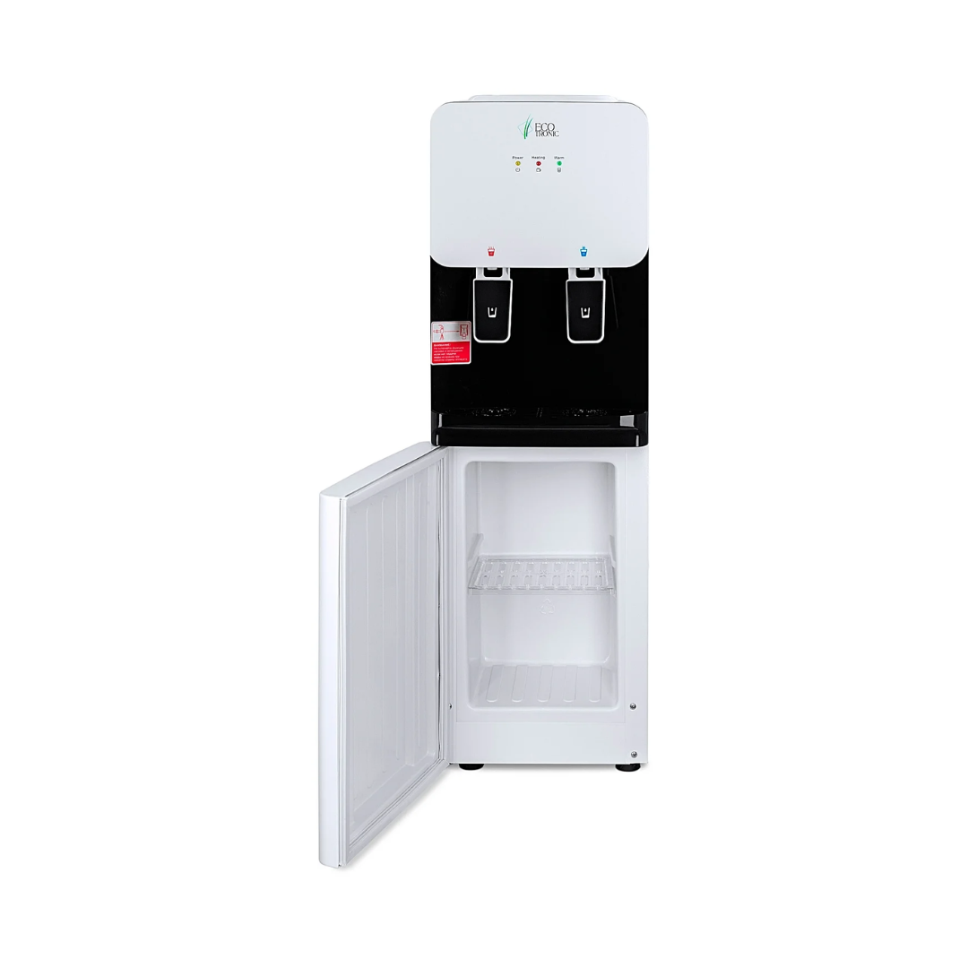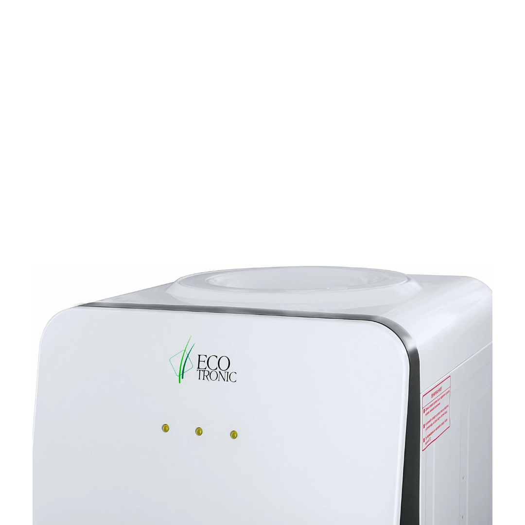 Компактный раздатчик для воды без нагрева и охлаждения. С небольшим шкафчиком в нижней части. Корпус белого цвета с черной вставкой в области кранов подачи воды. Без подключения к сети. Краны «нажим кружкой». Передняя панель сверху имеет широкое ровное пространство, подходящее для брендирования и нанесения логотипа.