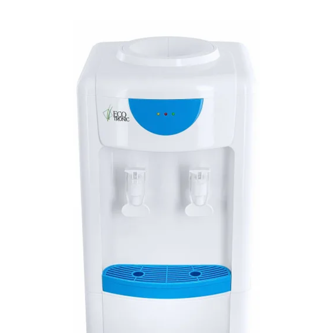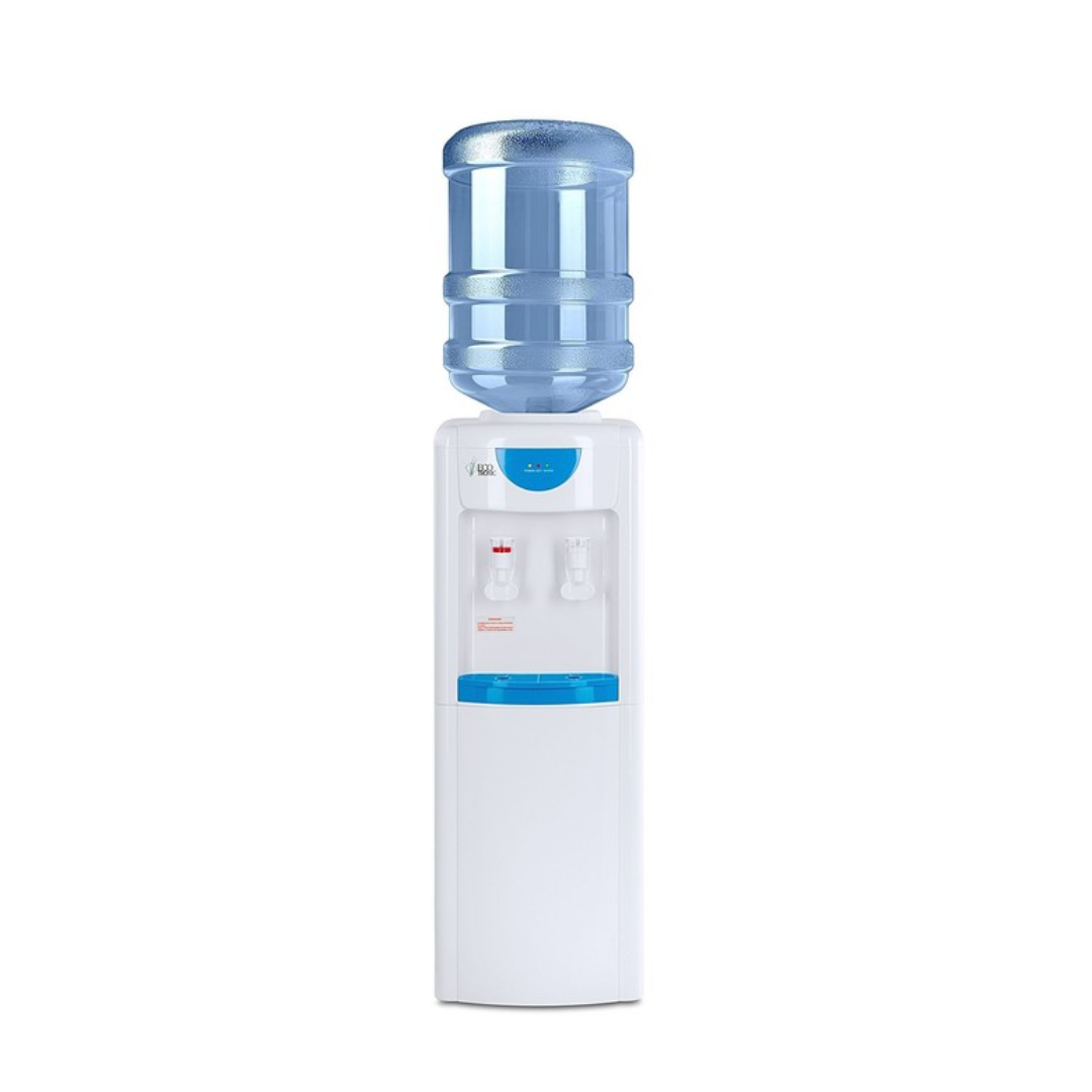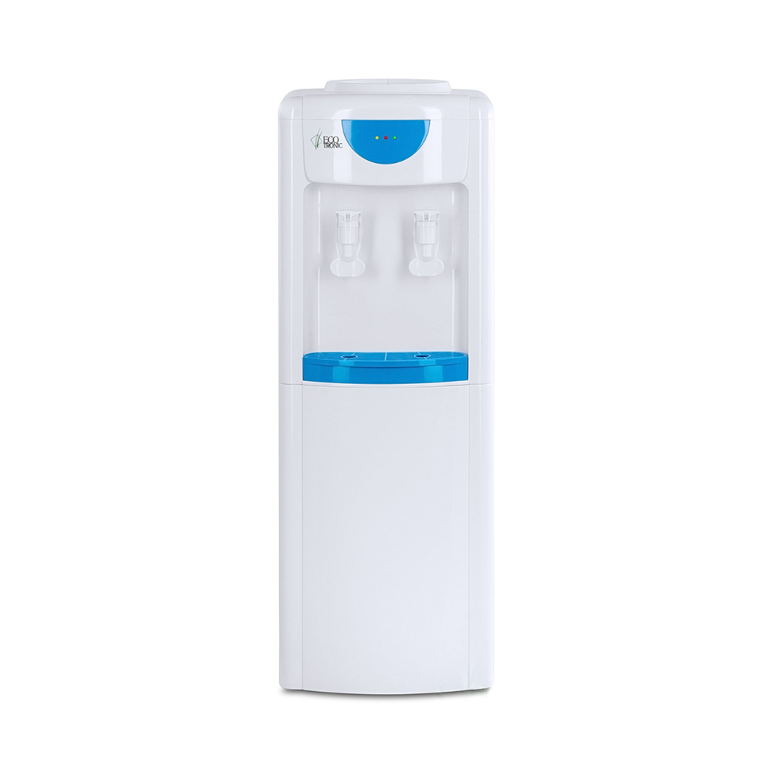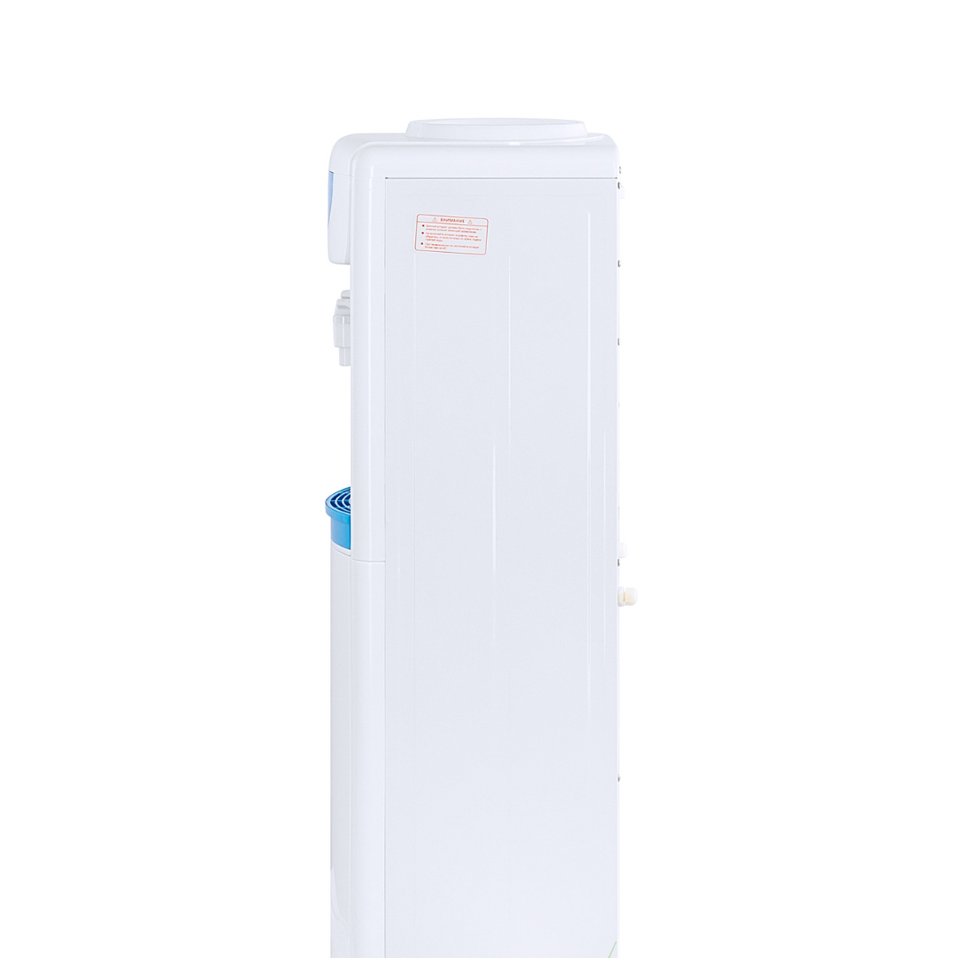 Раздатчик воды компактного размера. Бюджетный вариант напольного раздатчика воды, без нагрева и охлаждения. Два крана подачи воды комнатной температуры. Корпус белого цвета с голубыми вставками. Краны «нажим кружкой».